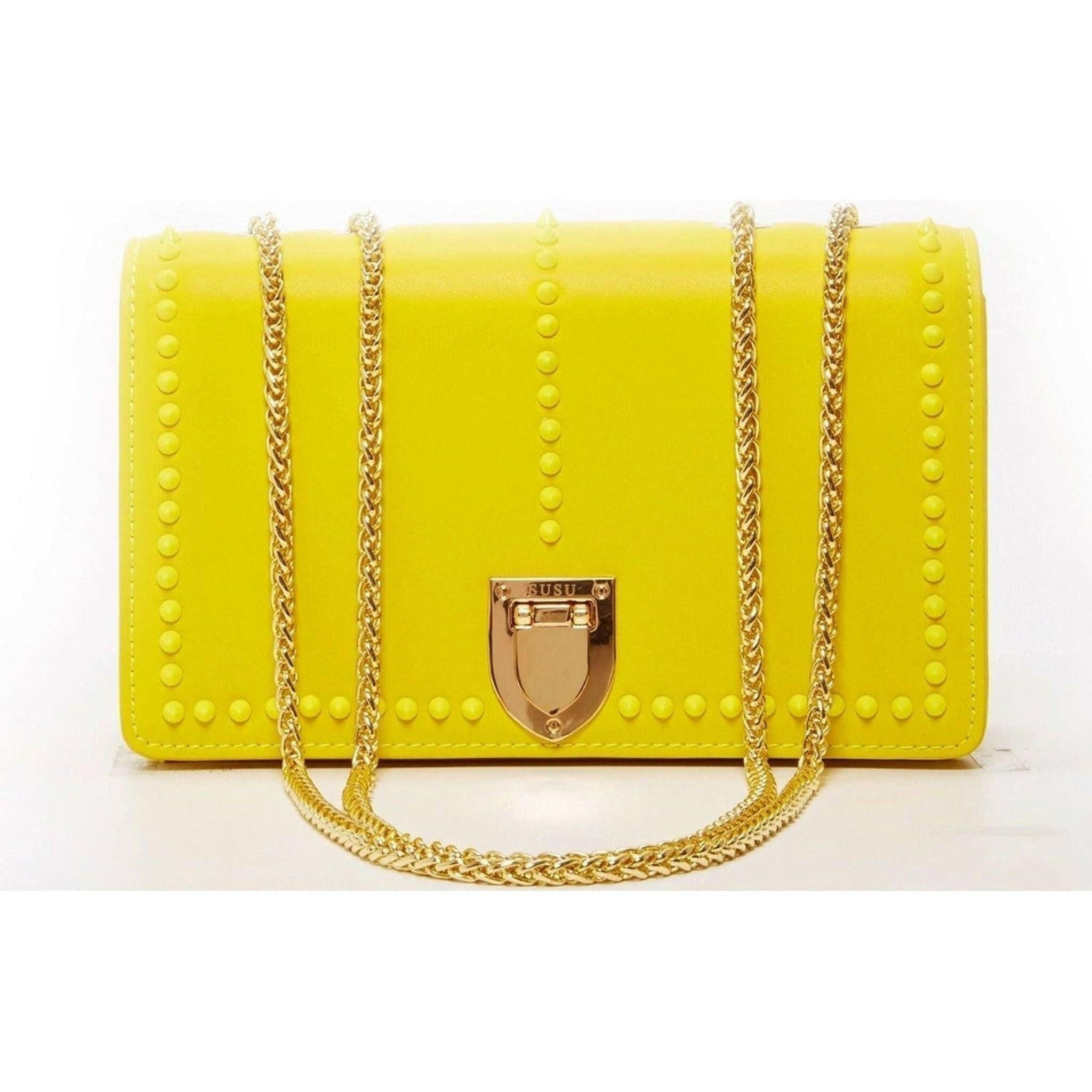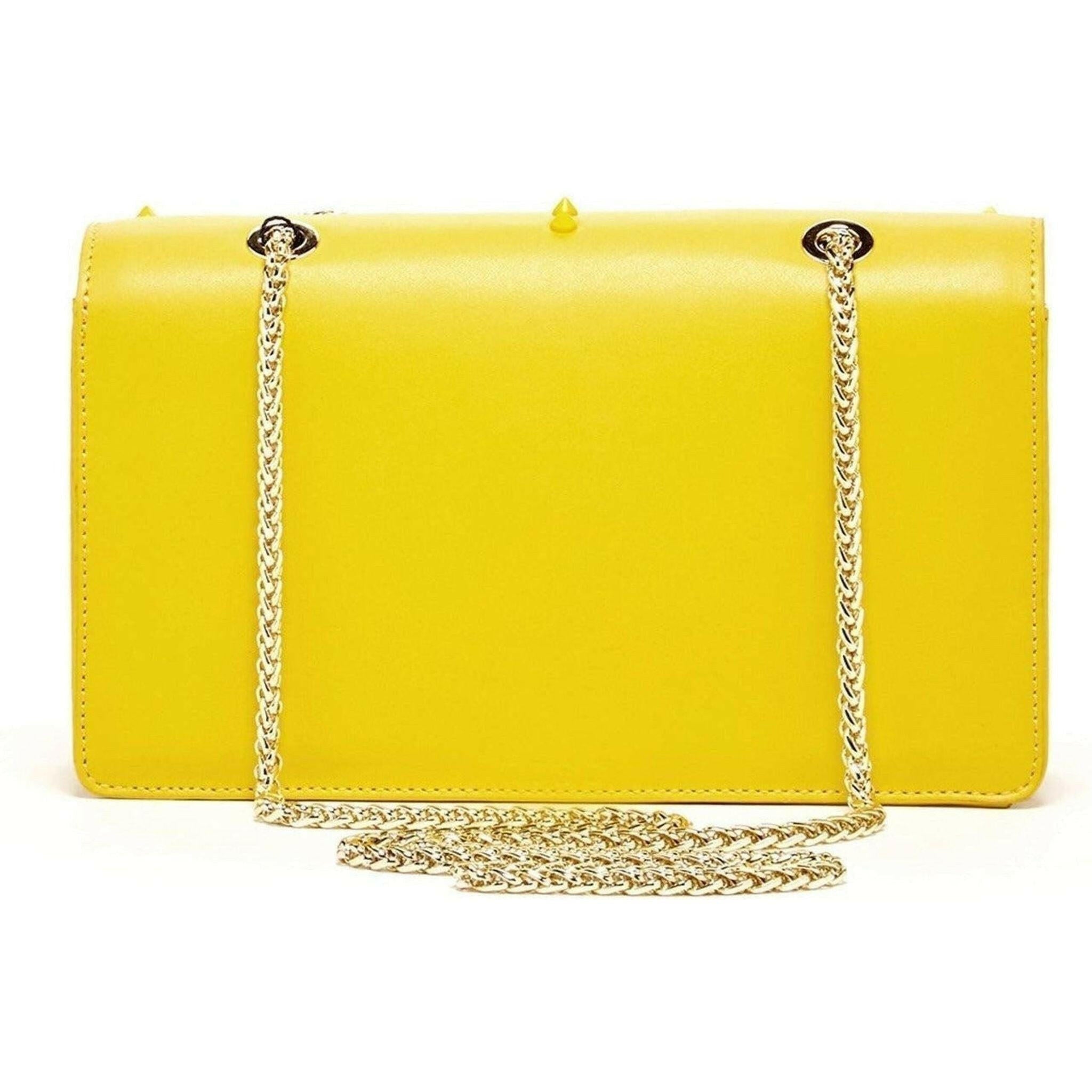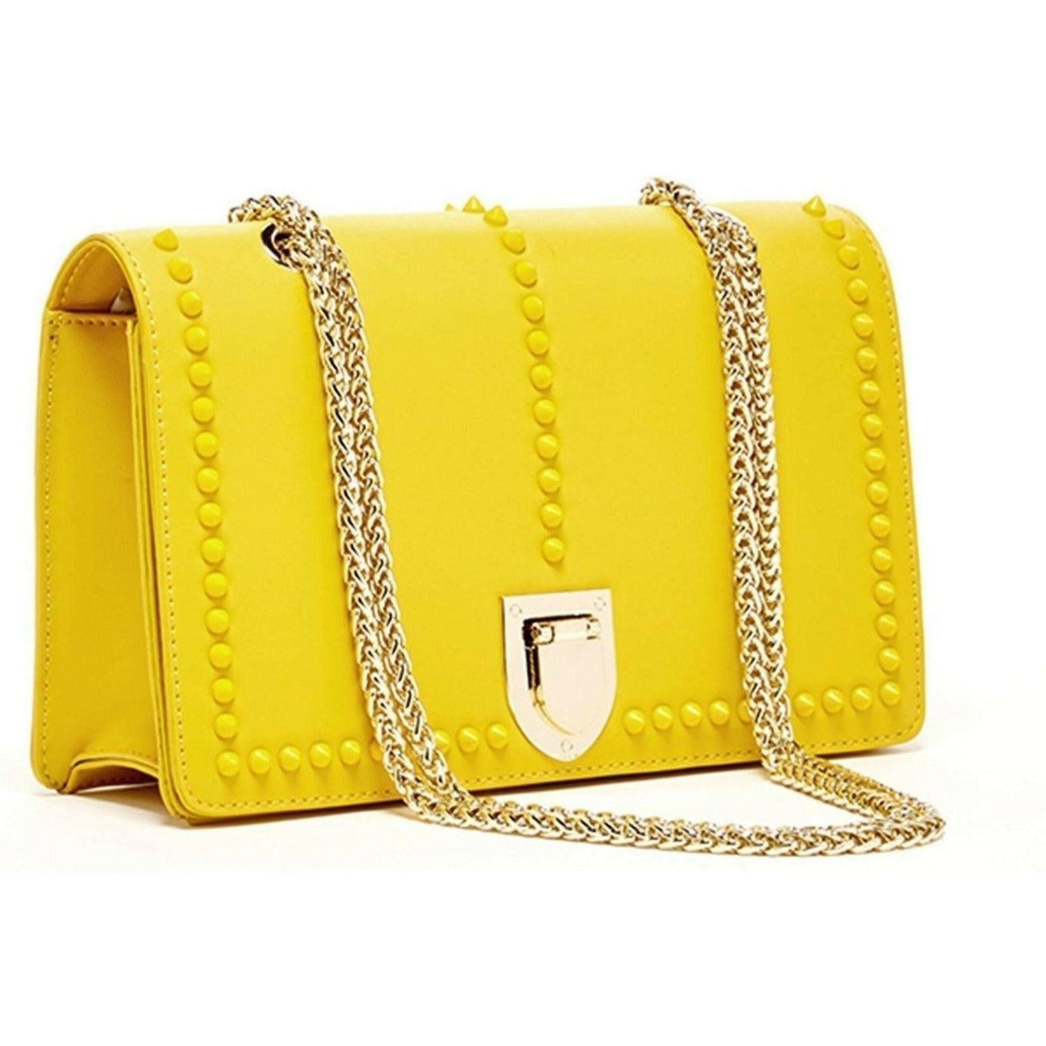 This fashionable forward Josie yellow leather purse, made with supple leather, will provide a timelessly chic look throughout the changing of the seasons. It is further enhanced by decorative leather studs on the front flap. With a buckle closure, the fabric-lined interior includes a zip pocket, cell phone slip and 6 credit card slots. Its elegant light gold chain strap can be worn long as a stylish crossbody or doubled up for a shorter shoulder bag style.