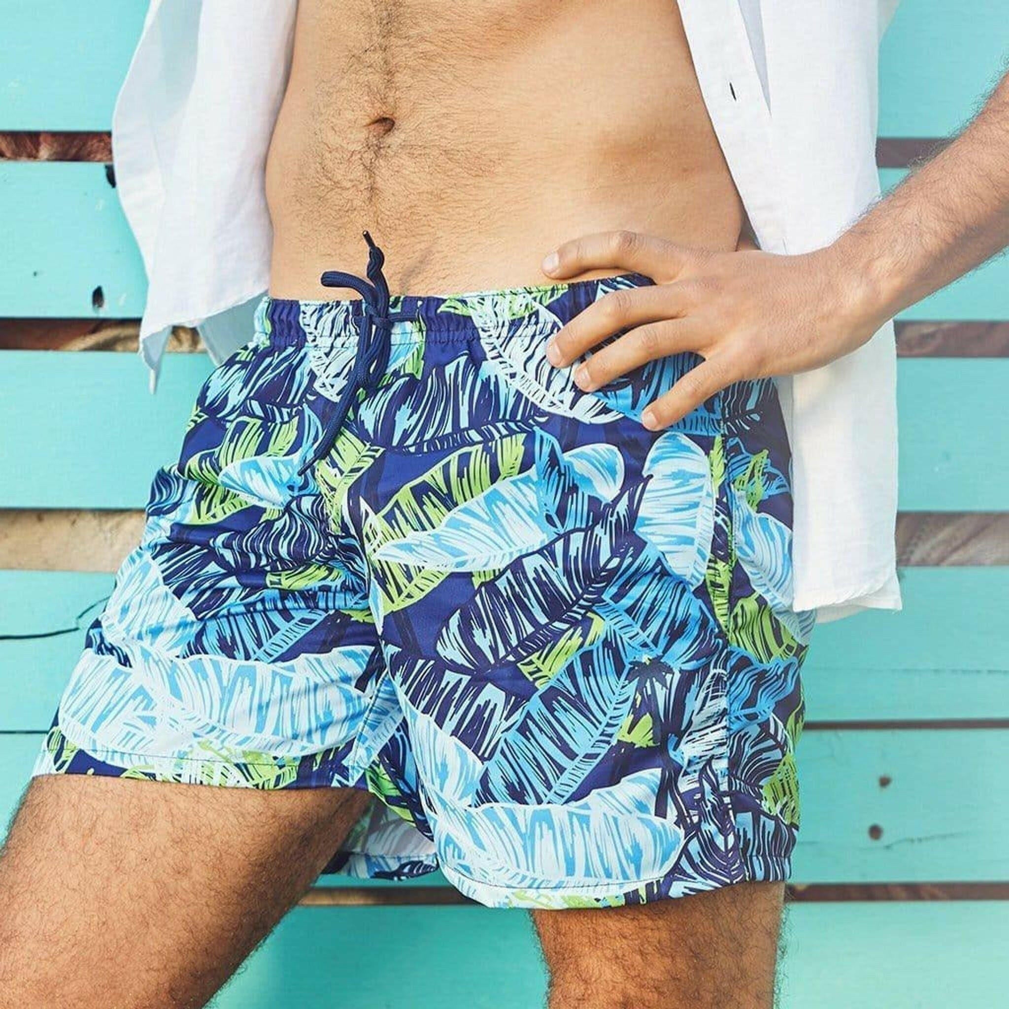 Colorful palm leaves make these quick-drying swim trunks immediately into chill mode.