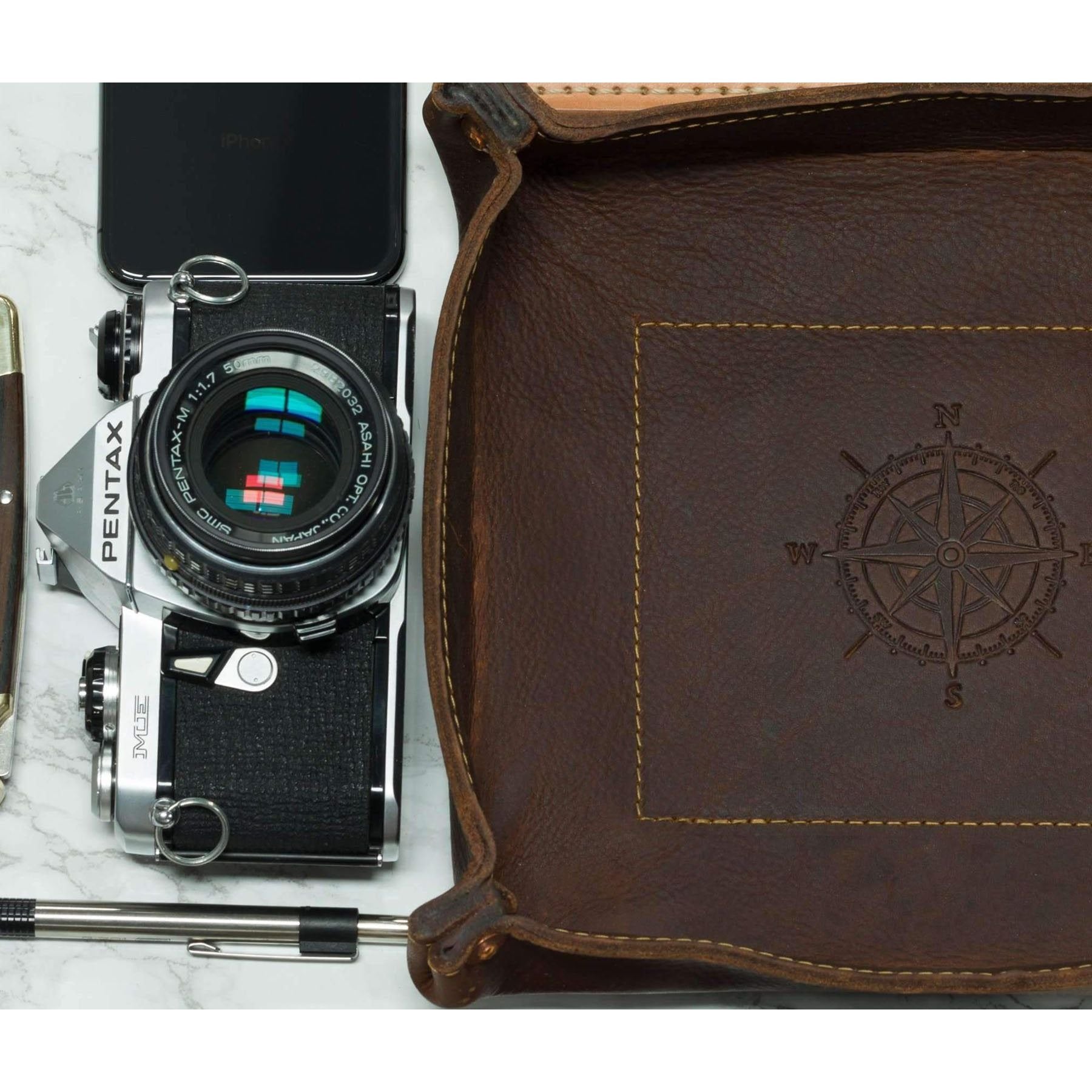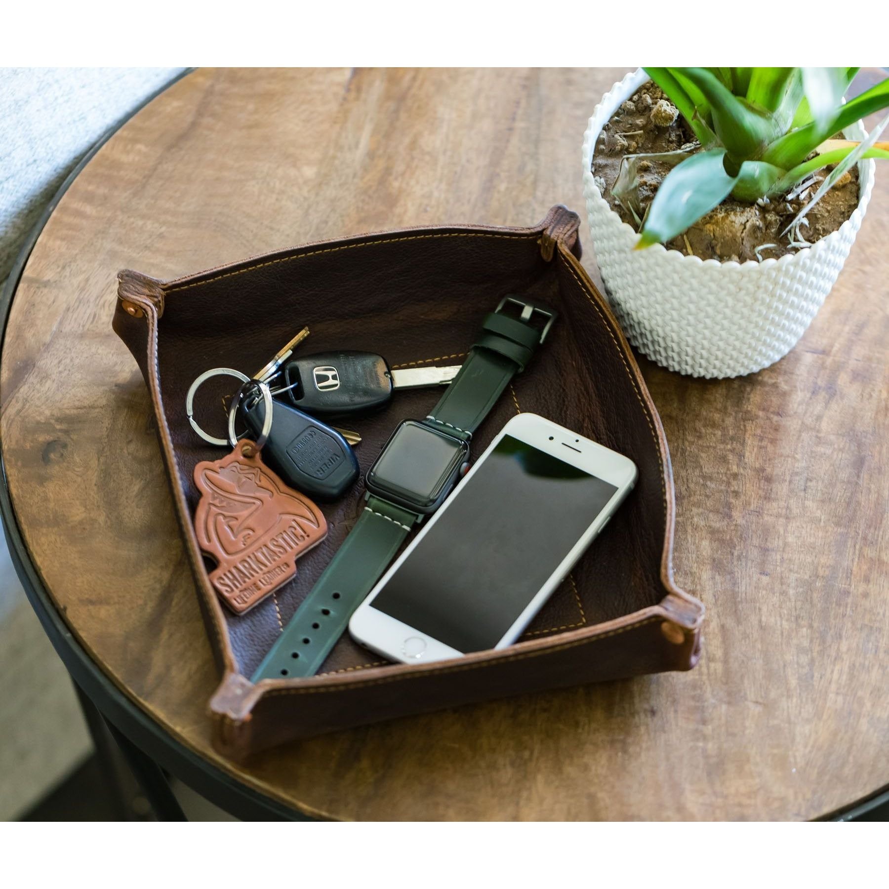 Perfect for by the computer, front door, in bedroom. It's a great and classy way to hold those wandering belongings. This leather valet tray is handcrafted with the genuine American full grain leather and heavy duty hardware -- no skimping on quality! You can personalize with beautiful fire branded symbols in the center to make it a special gift.