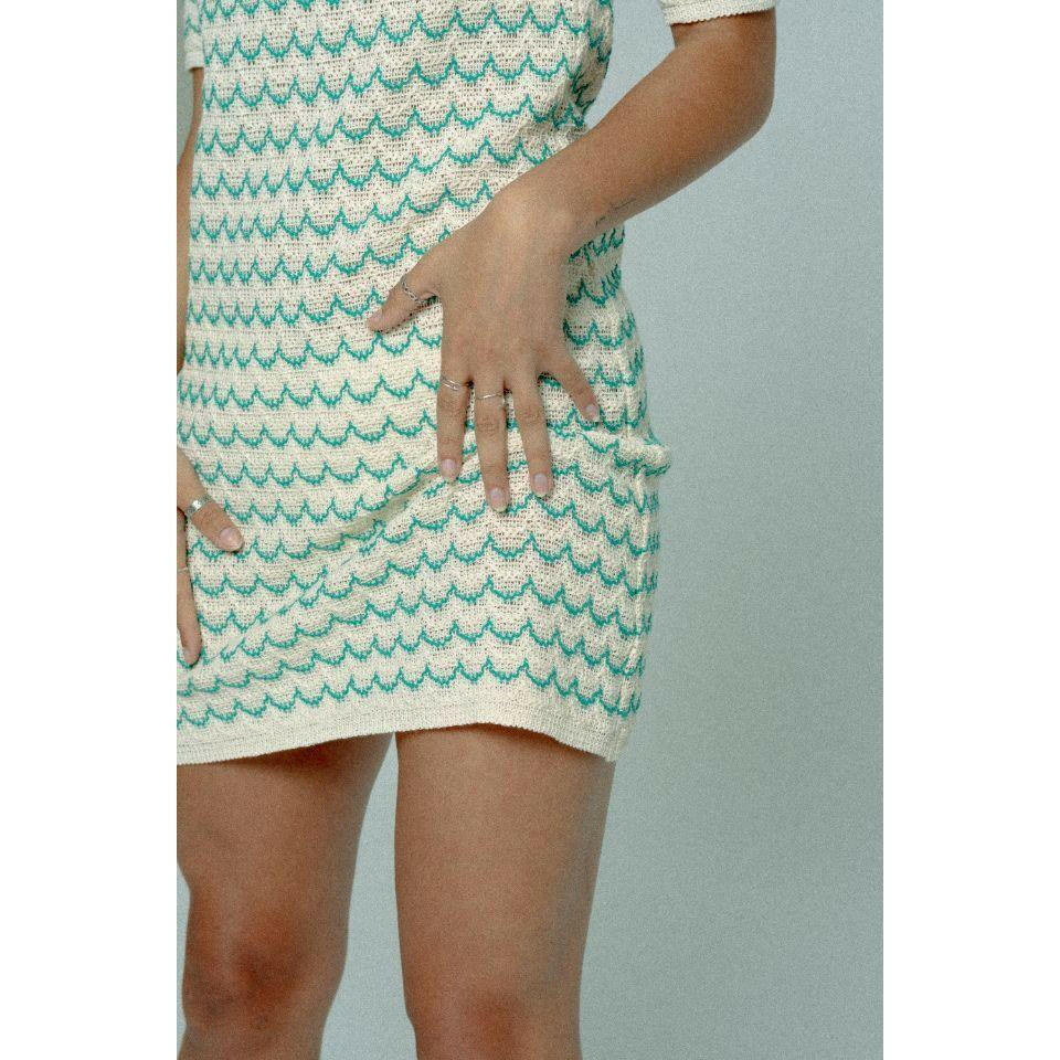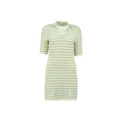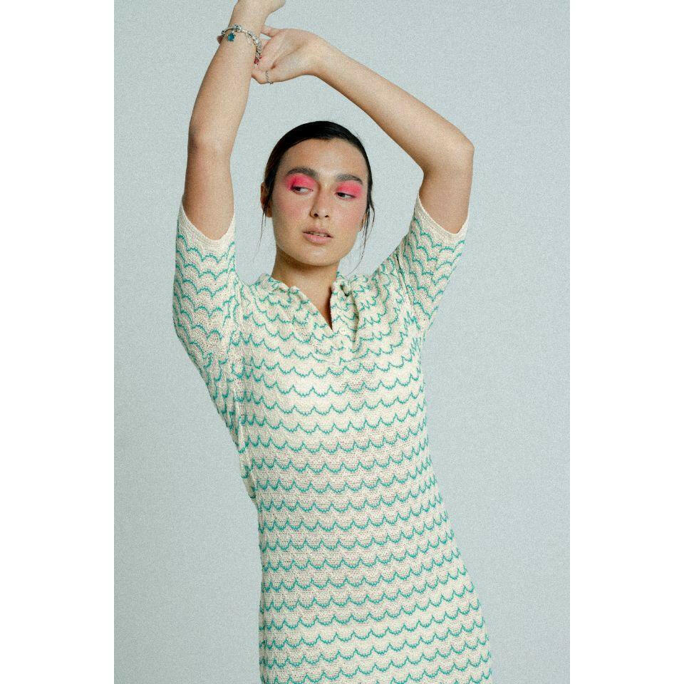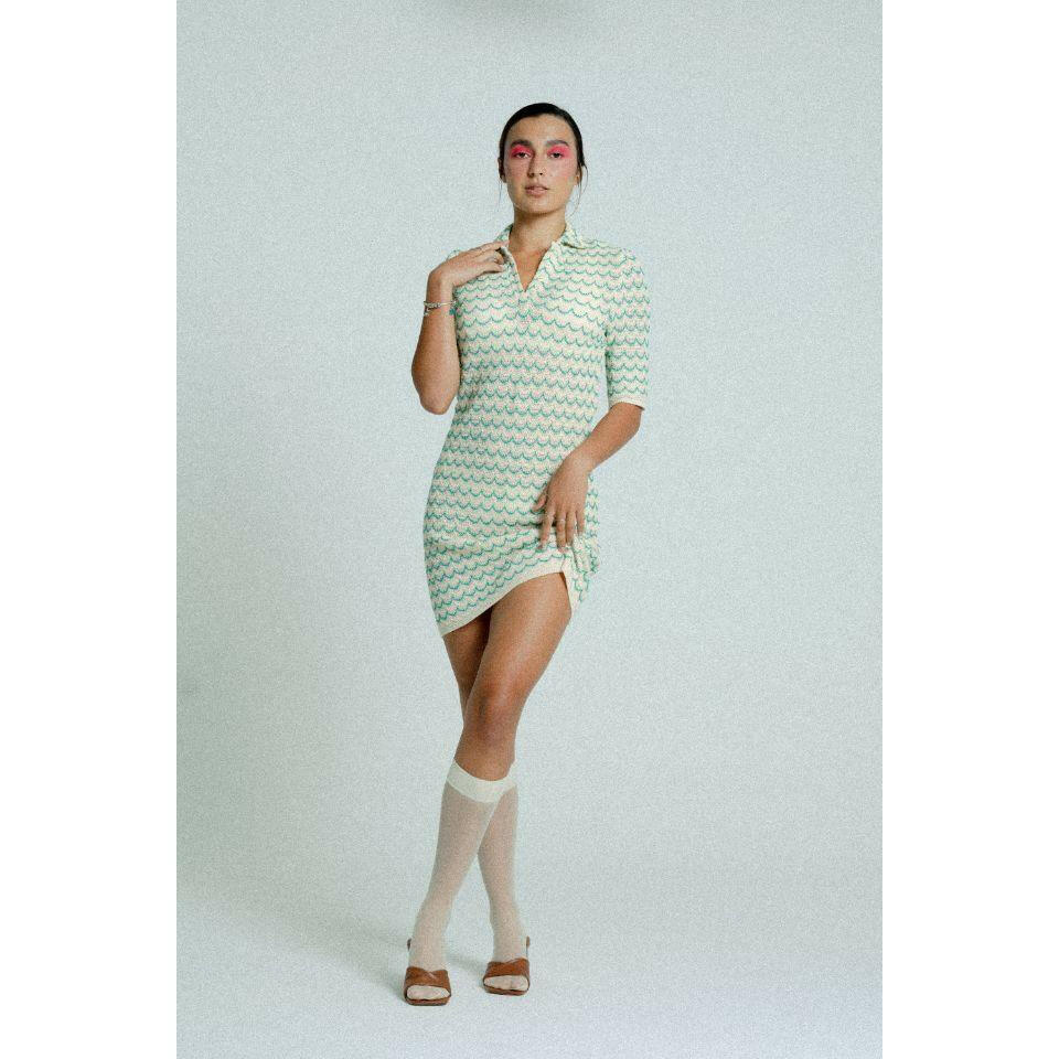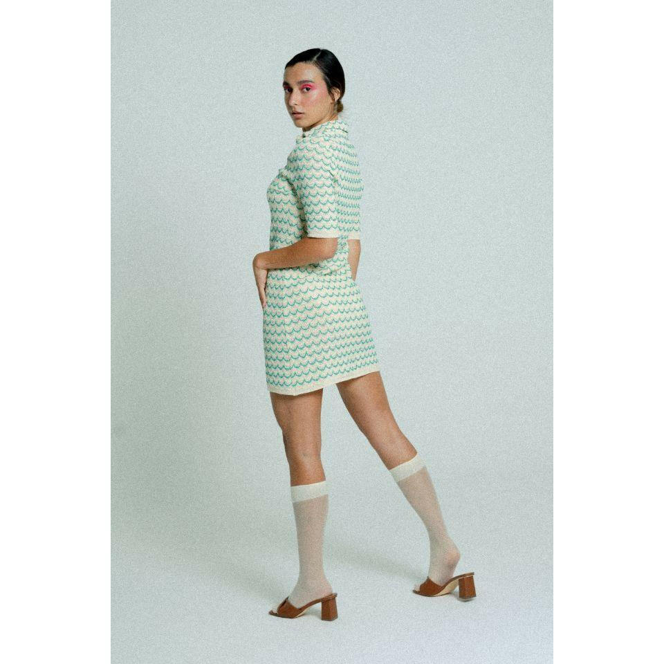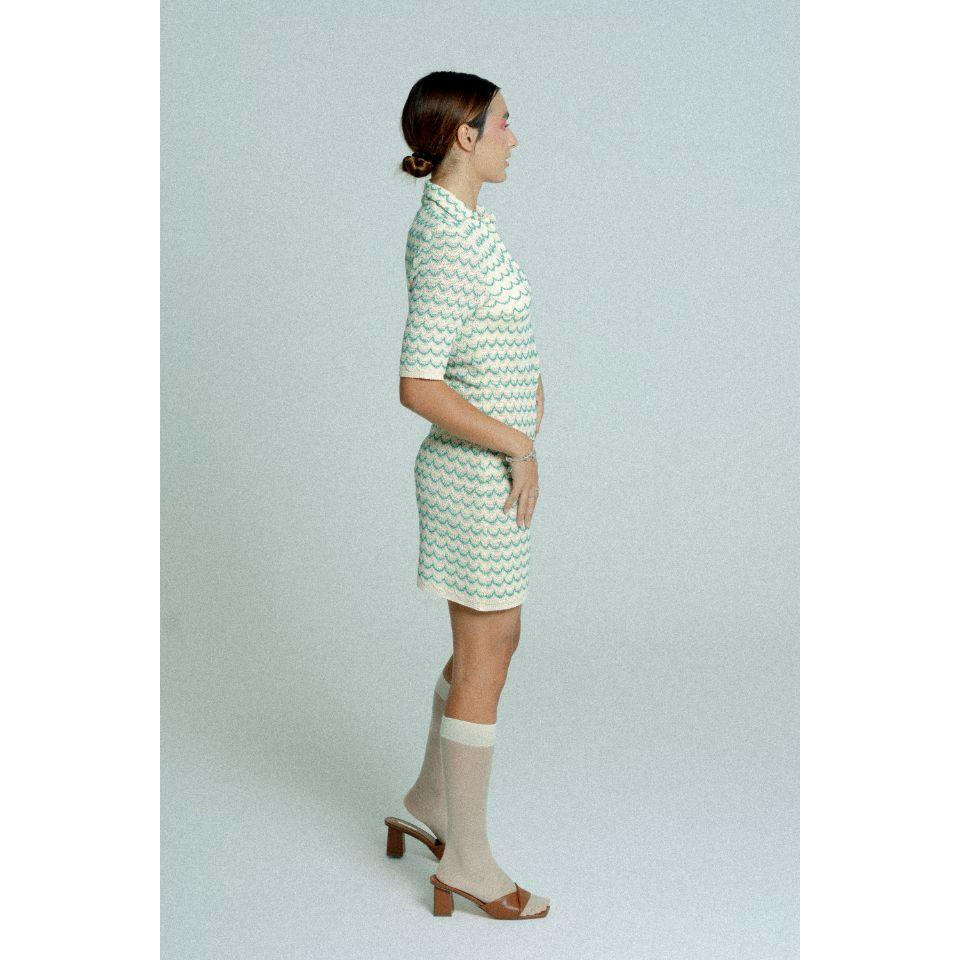 A classic straight cut short sleeve polo dress with a button up collar, made from beige, slightly see-through cotton knit with green waves. Classic cut with an edge, finished with beautiful detailing and wooden effect buttons. Hugs the body in all the right places and gives any outfit an extra touch.