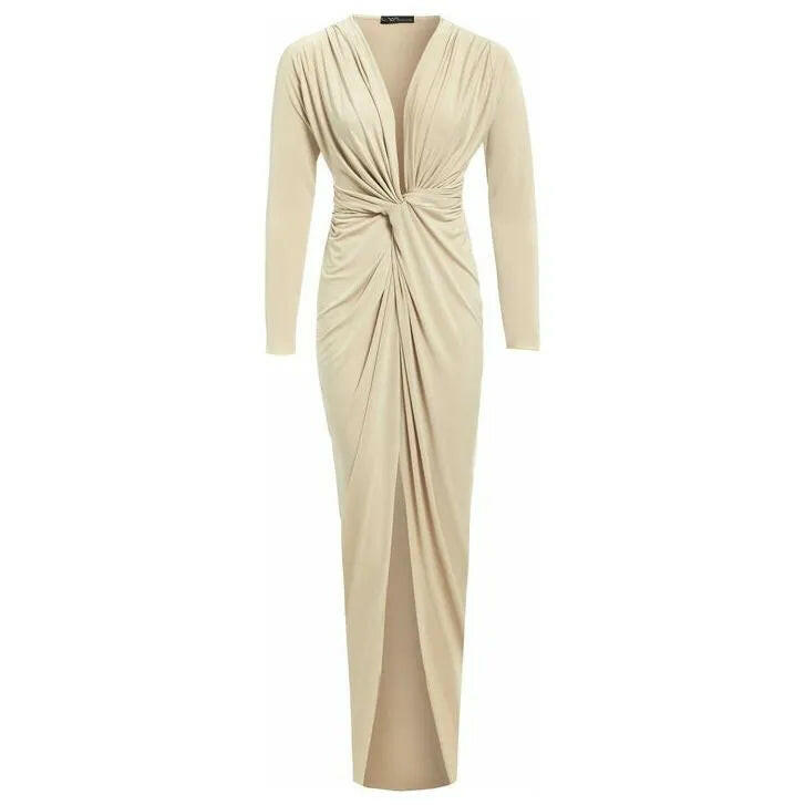 Introducing Bianca low cut dress with a plunging neckline in Stone colour, as seen in Vogue and Flawless magazines. Make the Bianca knot front midi dress your wardrobe must-have. This slick long, sleeve midi dress is cinched in at the waistline with a sophisticated front knot design. Bianca's deep plunge V-neck and tantalizing thigh slit will be the statement piece all year round.
