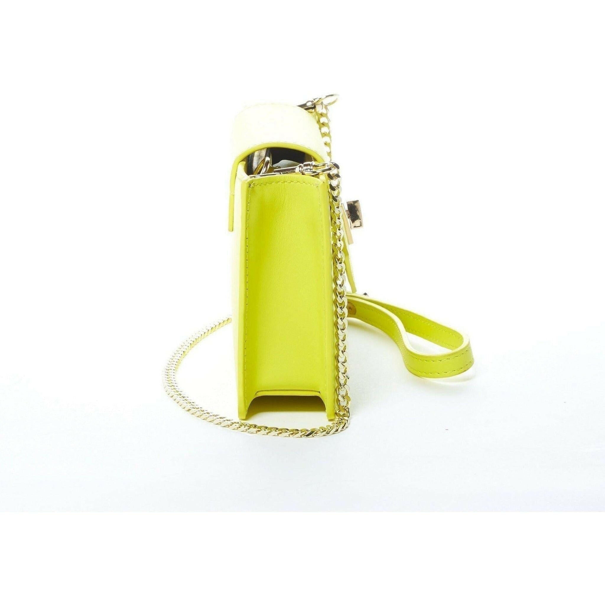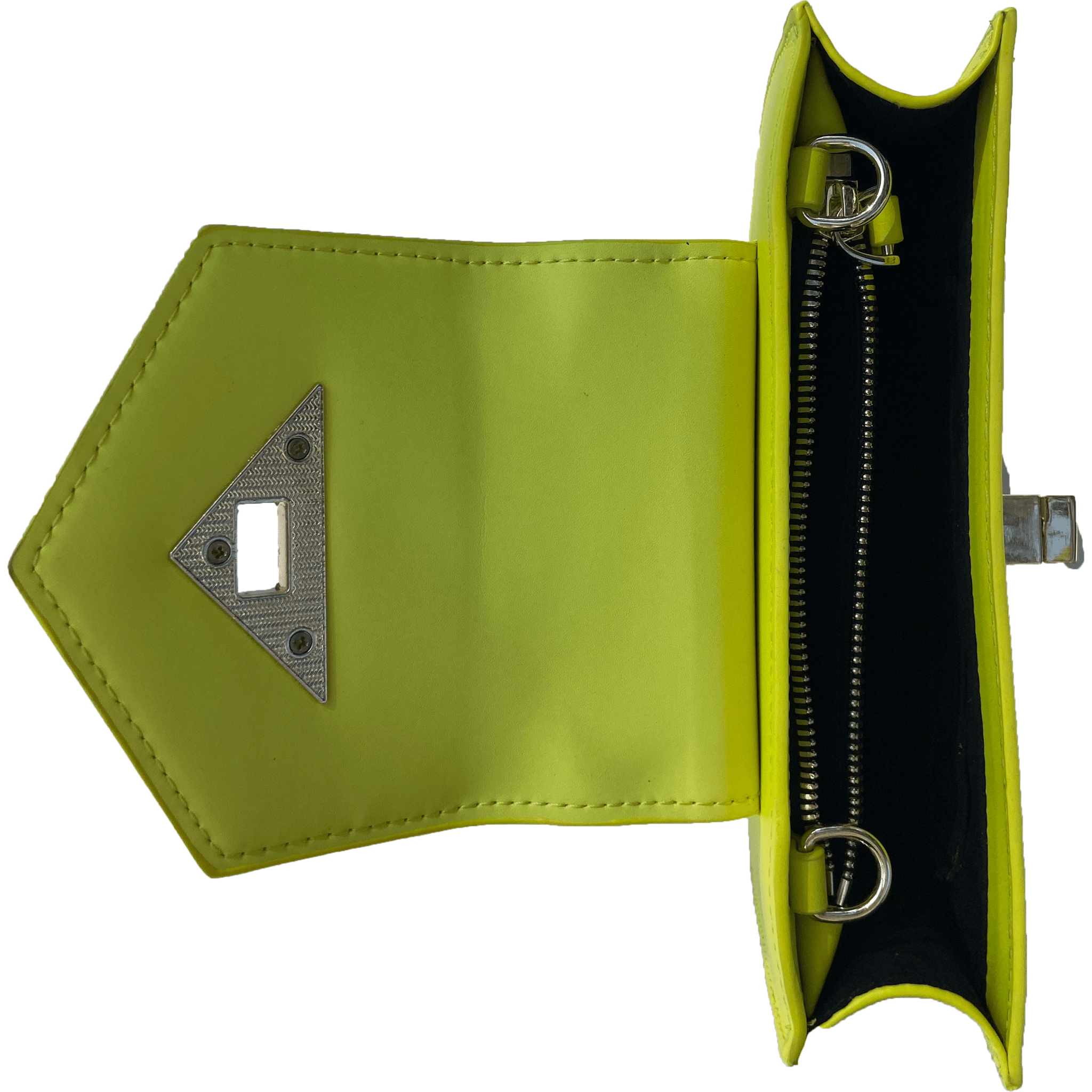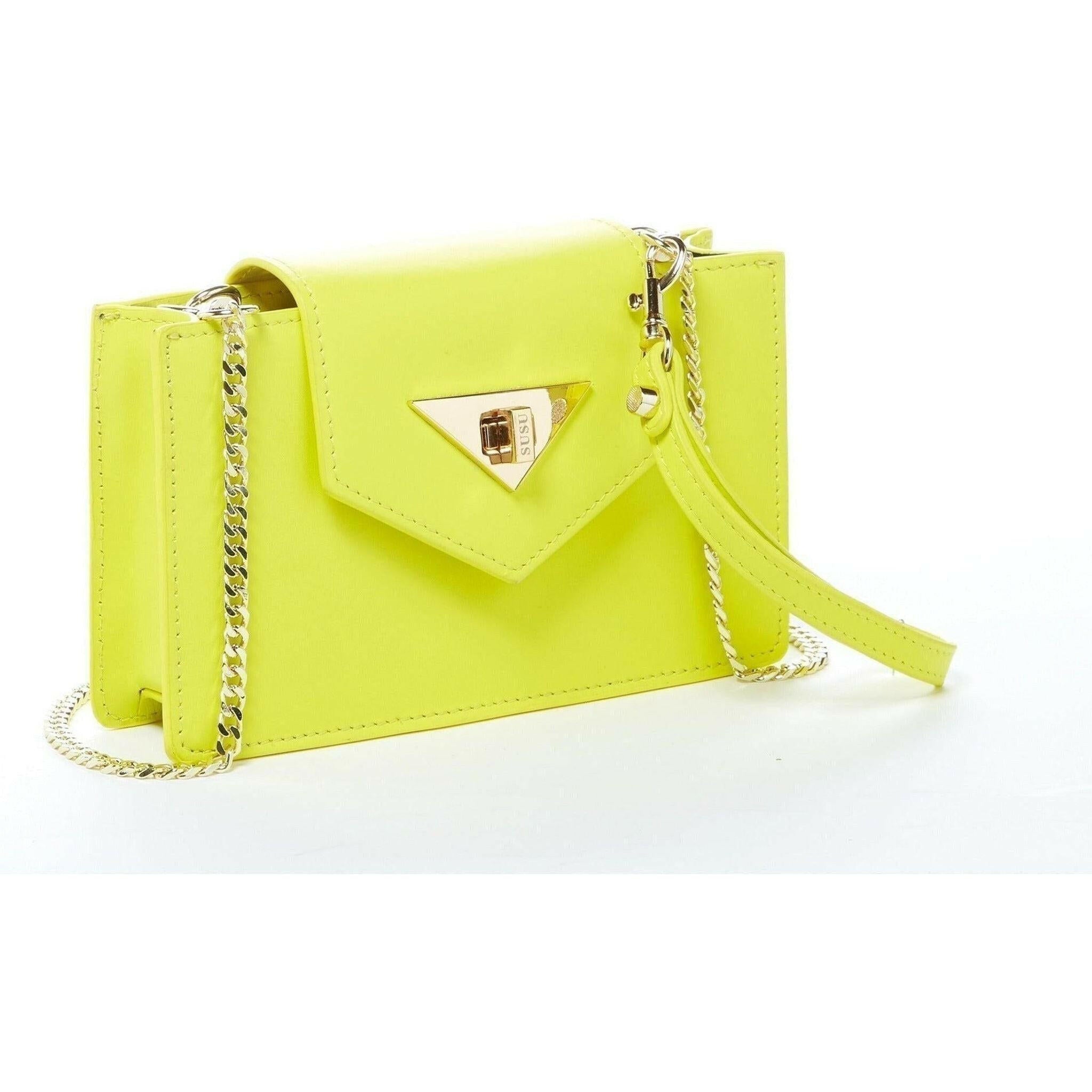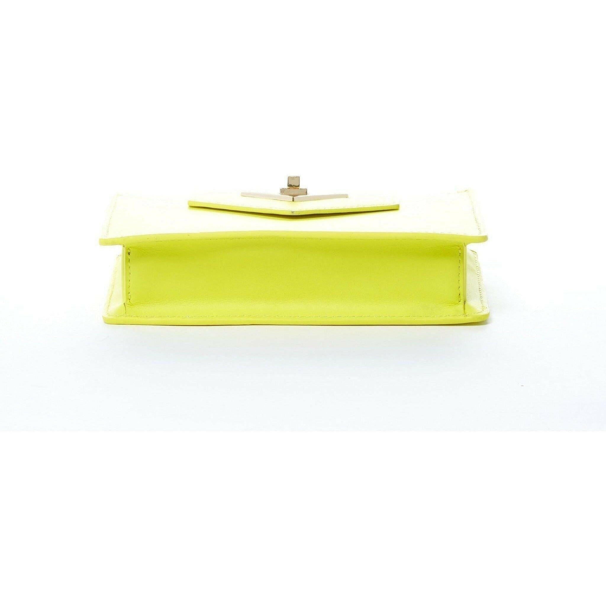 The Mary is a modern geometric crossbody wristlet with a boxy structure and a sturdy angular flap. Made from an electric bright yellow leather, the sharp angles throughout the design of the bag contribute to its refined look. A twist lock is placed sleekly within a statement piece of gold accent hardware to keep the flap in place. It is accompanied by a luxurious gold chain as well as a wrist strap so you can wear it multiple ways.