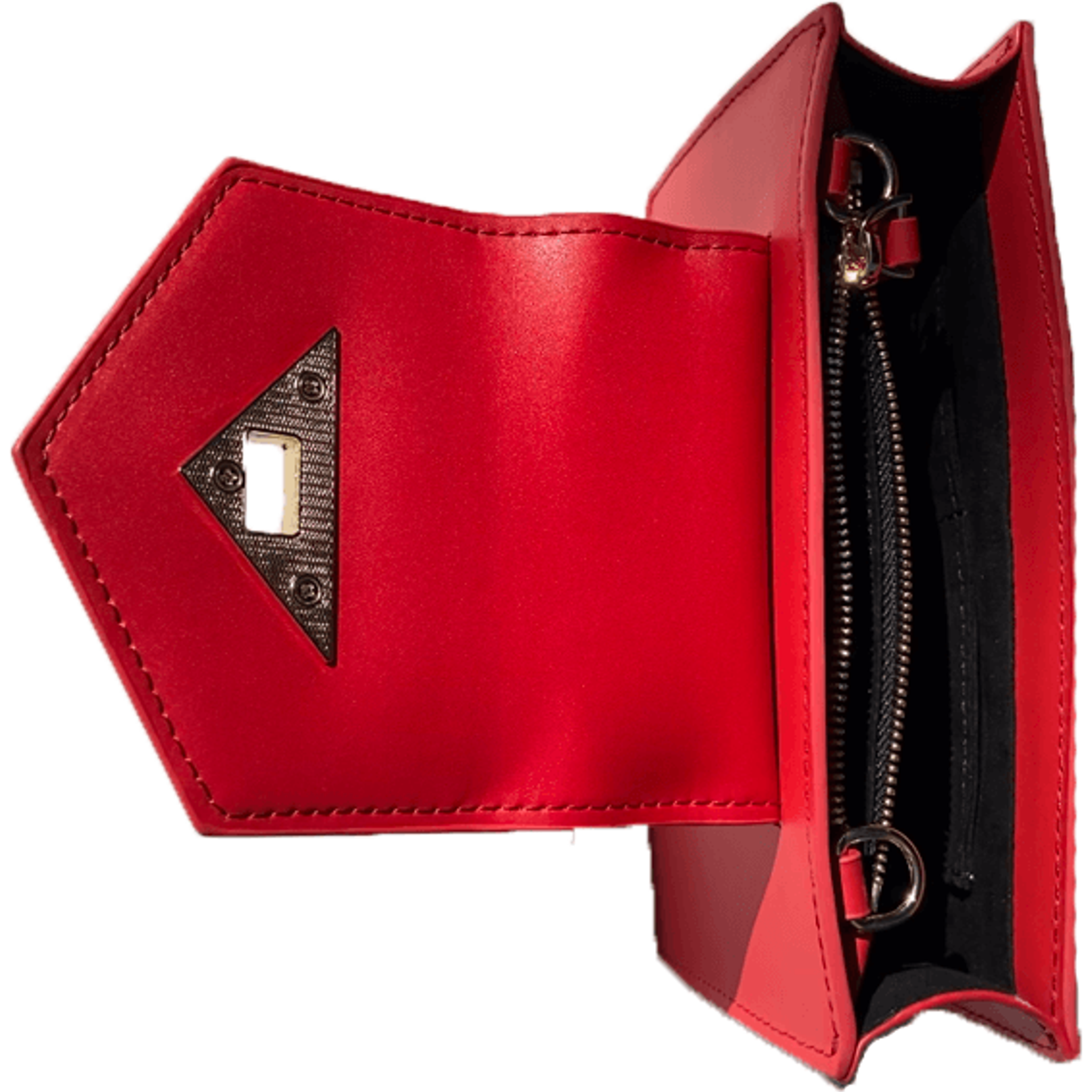 The Mary is a modern, geometric take on the classic mini crossbody bag leather wristlet. With a boxy structure and a sturdy, angular flap, this bag’s put together look will serve as a boost to your confidence. Composed of show stopping bold red leather, you are sure to feel stylish with the Mary on hand. A twist lock is placed sleekly within a statement piece of gold accent hardware to keep the flap in place. The sharp angles throughout the design of the
