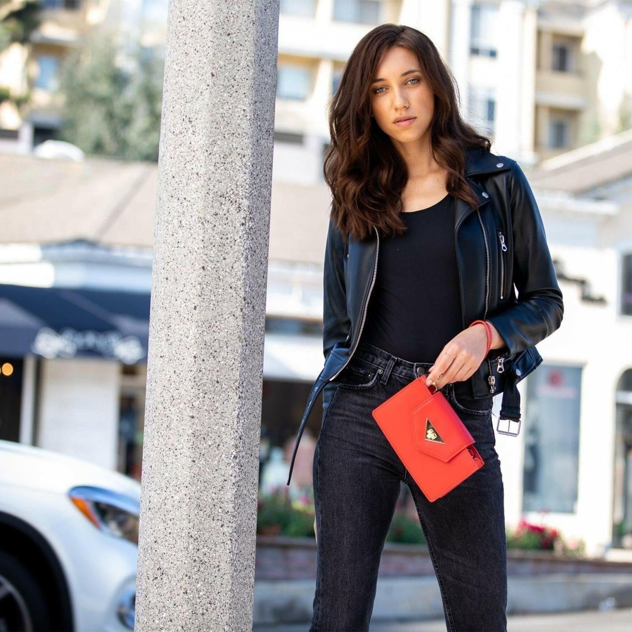 The Mary is a modern, geometric take on the classic mini crossbody bag leather wristlet. With a boxy structure and a sturdy, angular flap, this bag’s put together look will serve as a boost to your confidence. Composed of show stopping bold red leather, you are sure to feel stylish with the Mary on hand. A twist lock is placed sleekly within a statement piece of gold accent hardware to keep the flap in place. The sharp angles throughout the design of the bag contribute to its refined look. This small red leather crossbody bag is accompanied by a luxurious gold chain as well as a wrist strap so you can wear it multiple ways. The Mary is a simultaneously a crossbody and wristlet that is perfect for keeping all your essentials organized with one zipper pocket and 6 credit card slots. Its spacious interior fits even the largest smartphone models.