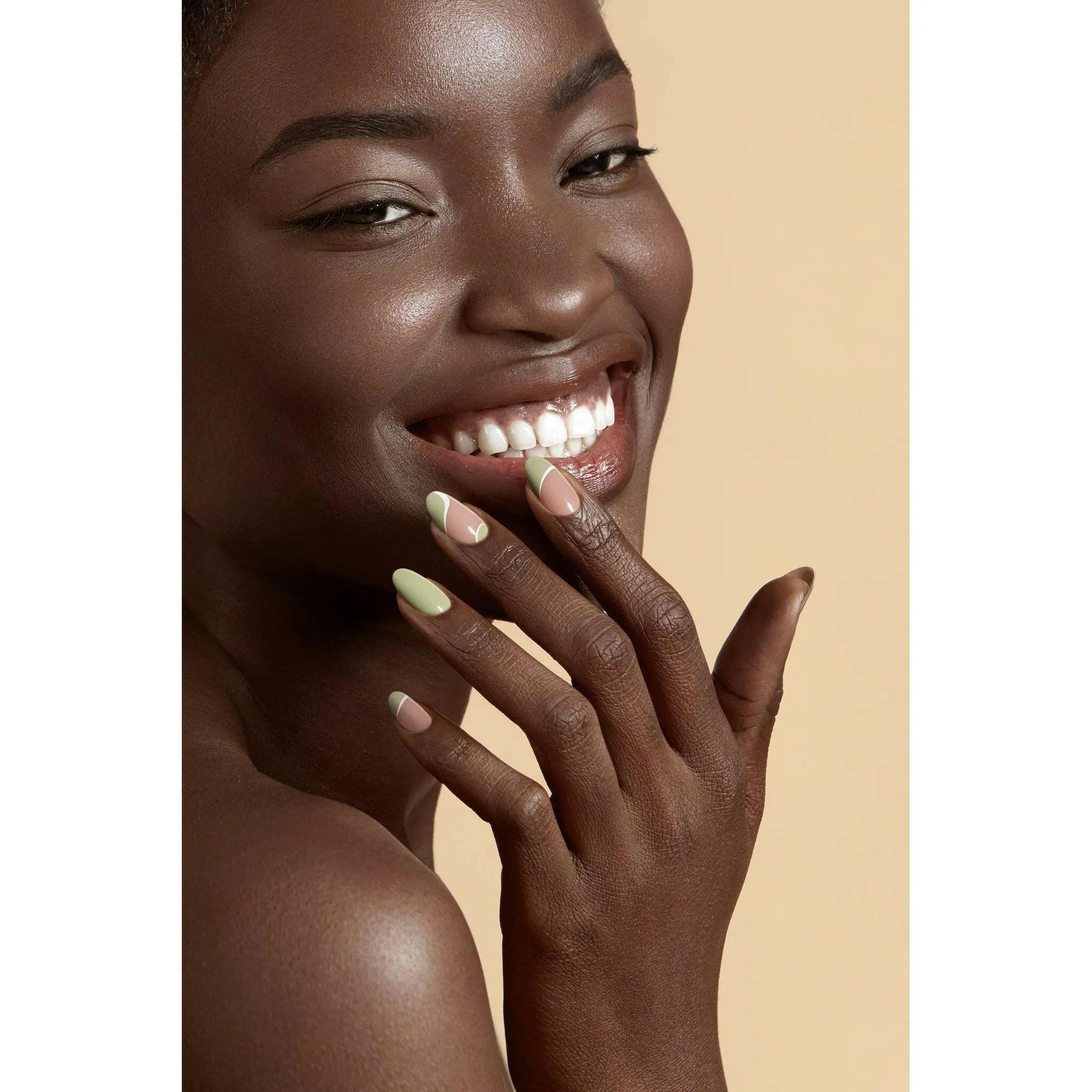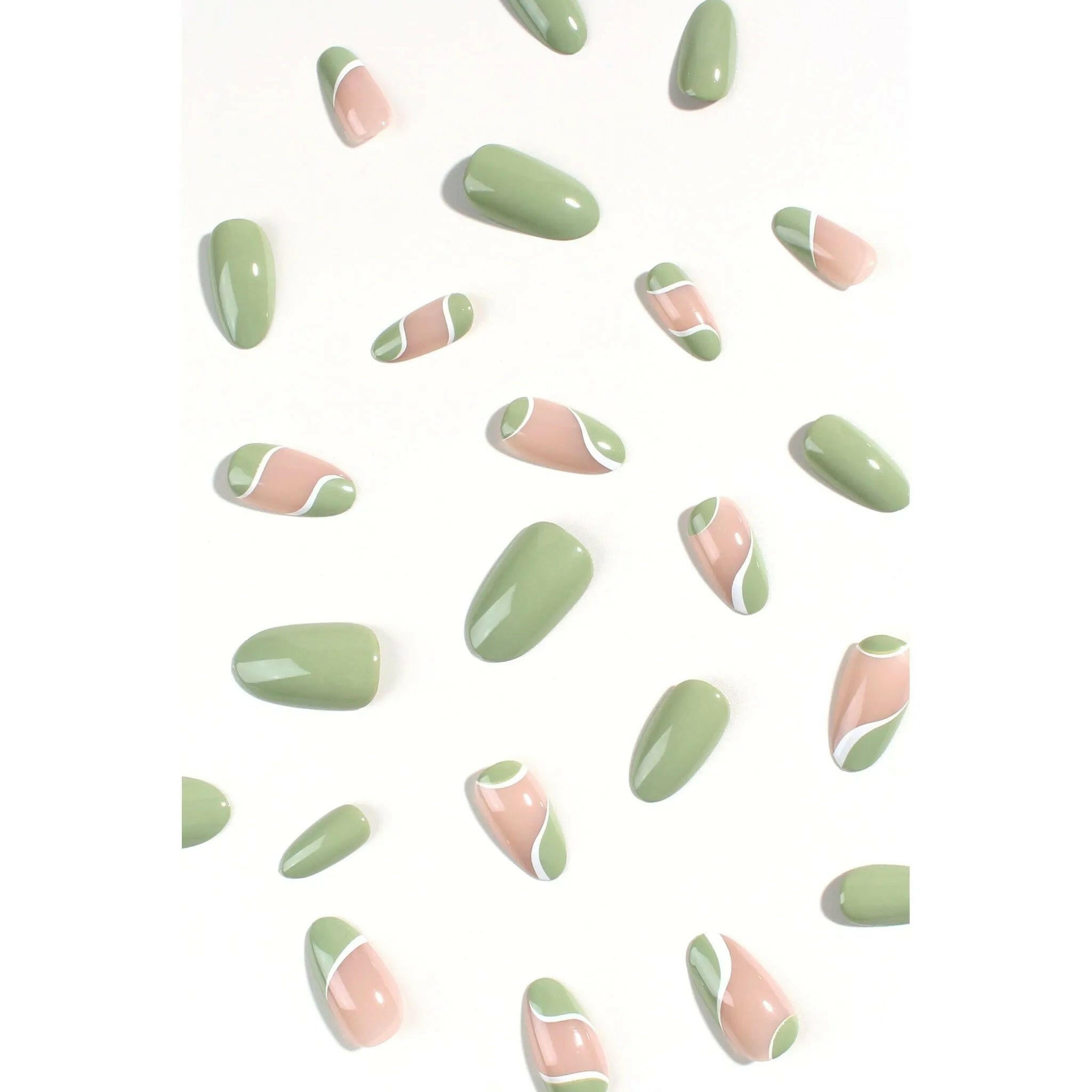 Matcha Delight press-on nails combine a serene matcha green shade with a creative swoop of white, artfully placed across a natural-toned base. These nails, with their smooth curvature and glossy finish, offer a unique and tasteful spin on nail art, perfect for those seeking to express a love for both traditional elegance and contemporary design.