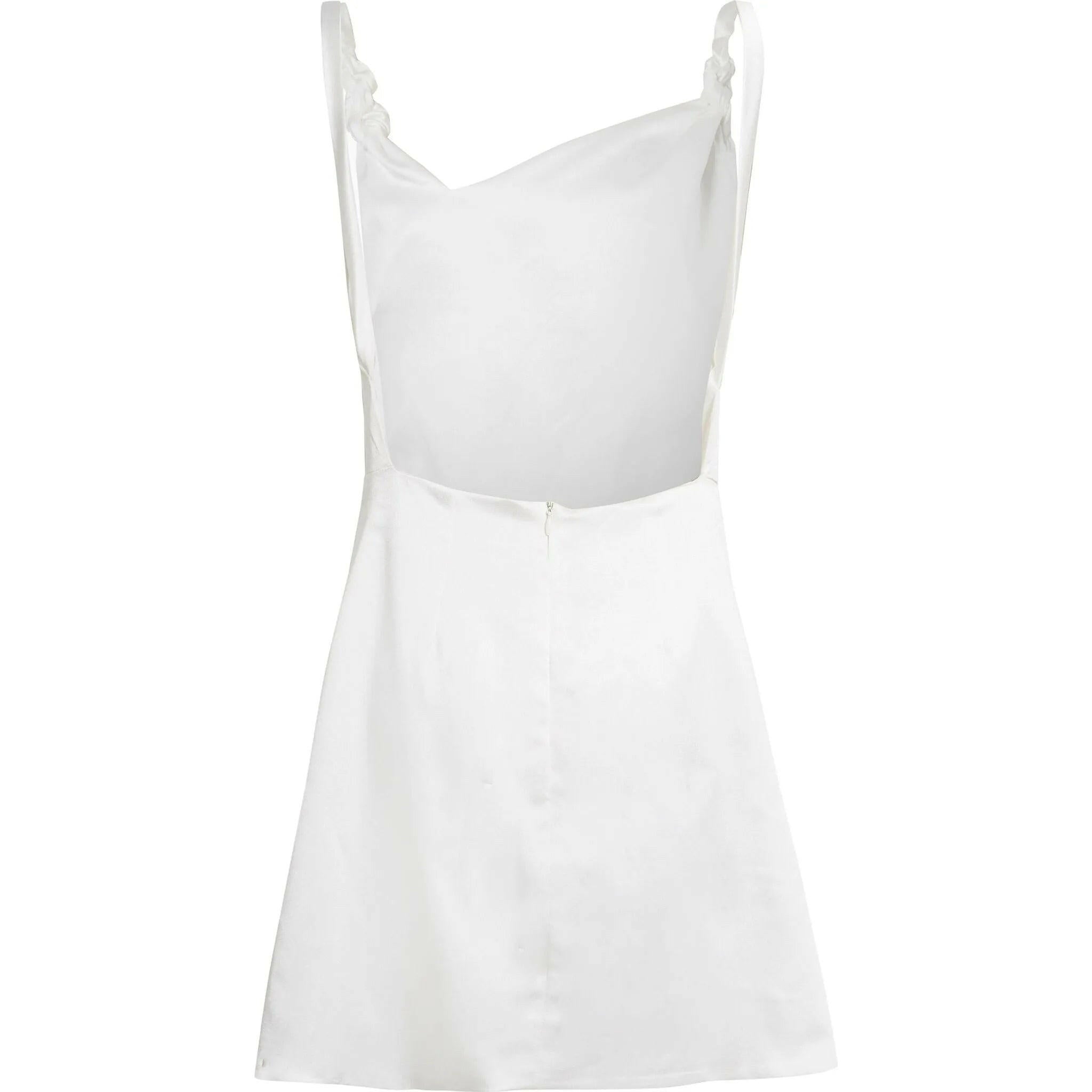Rosha Ivory white Mini slip dress simply oozes an effortlessly elegant look. Crafted from a slinky and silky satin fabric in a flattering Ivory white hue. It features a backless design and twisted adjustable straps with an asymmetric neckline. Style with a pair of chunky heels or white lace-up heels and a classic clutch bag.