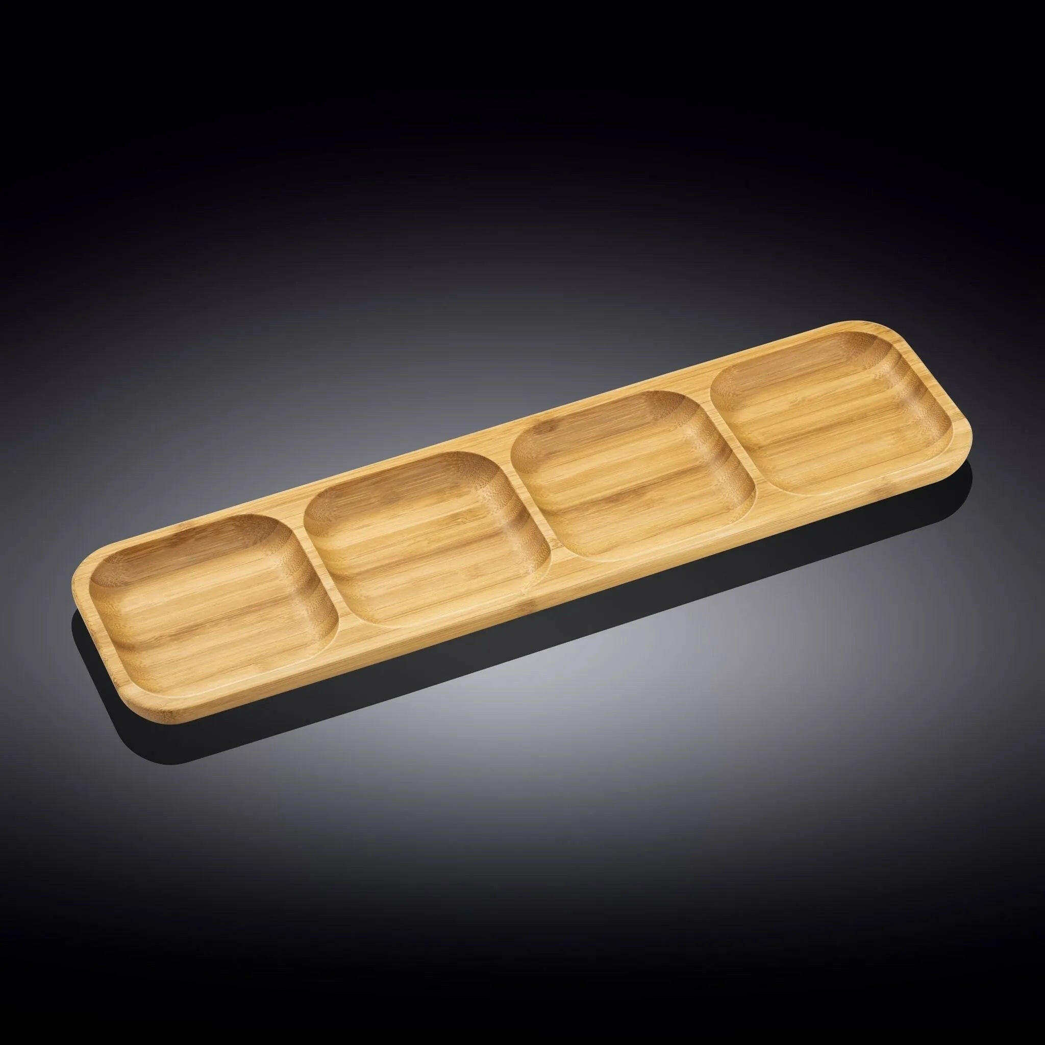- Tray, 17" X 4. 5" (43 X 11. 5), square, with (4) square wells, natural bamboo.