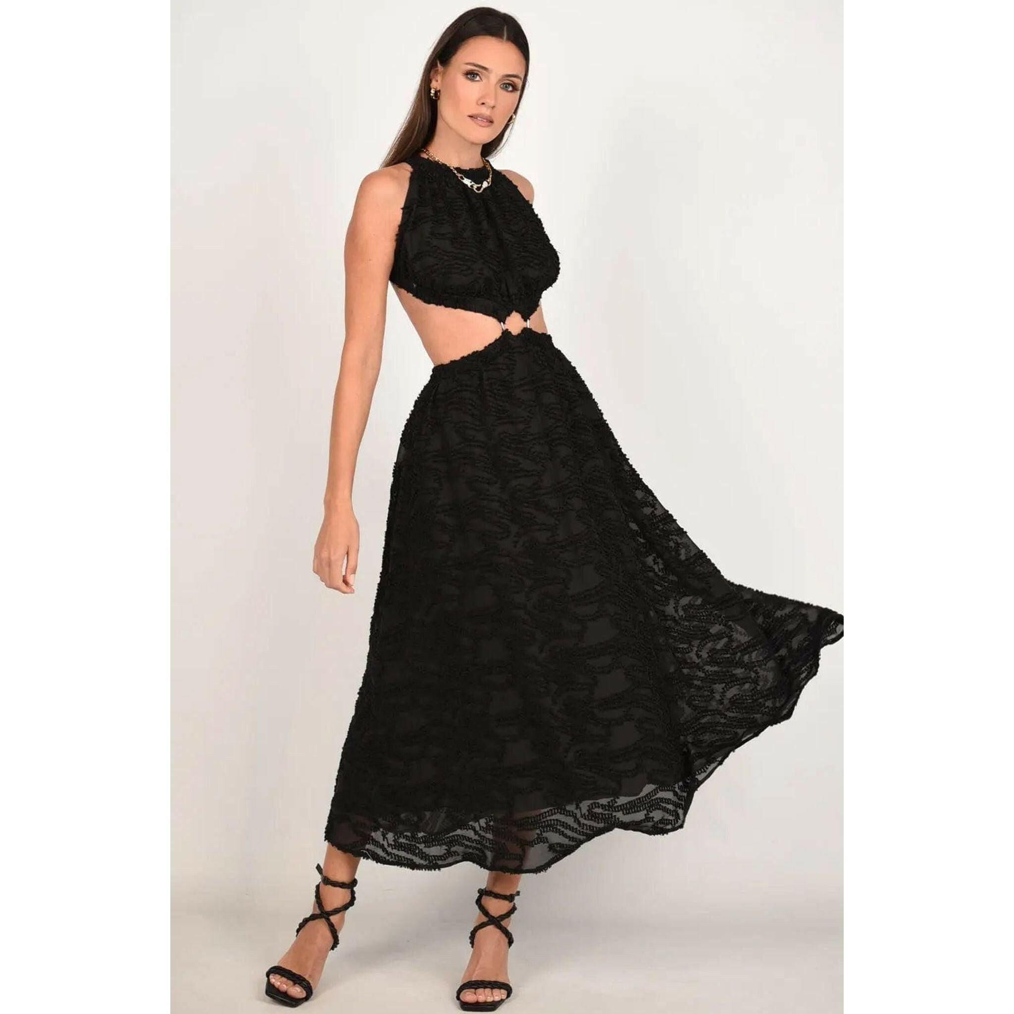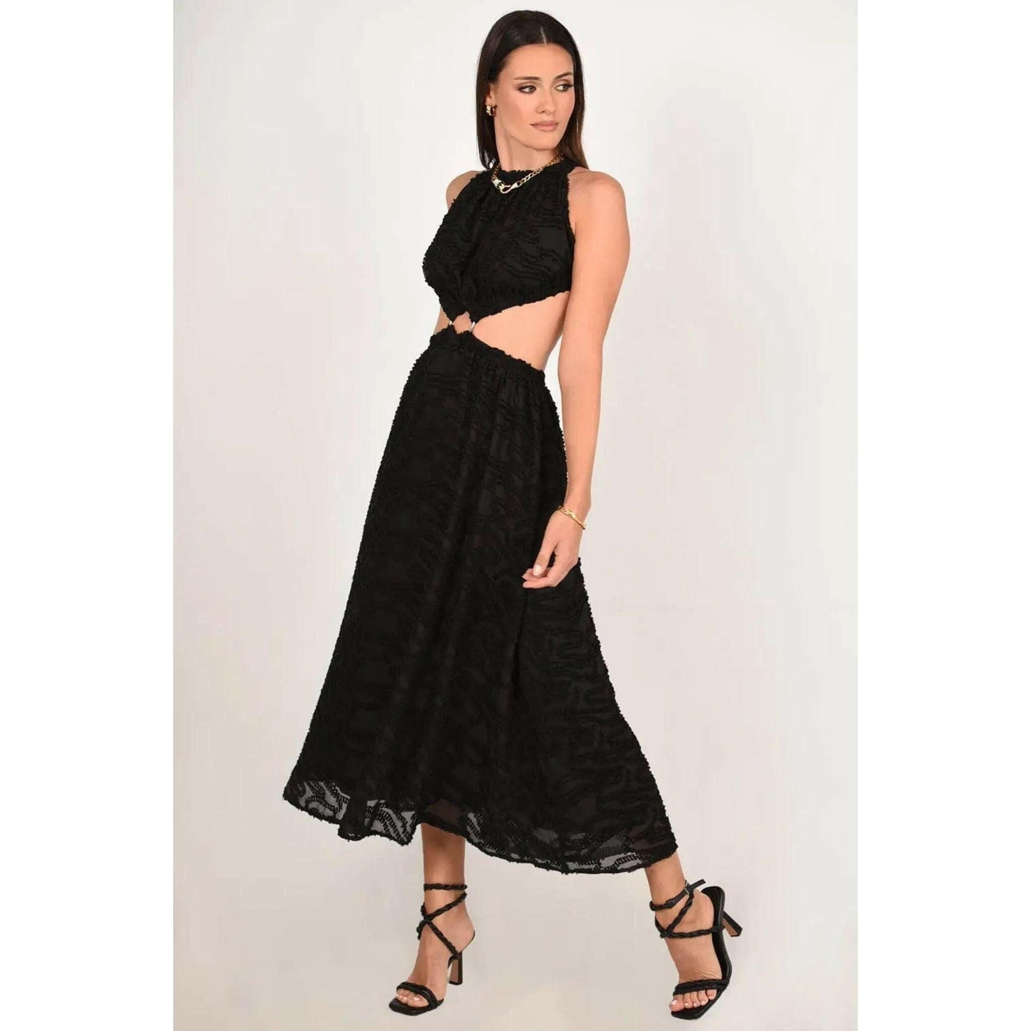 A unique backless pull-over maxi dress that is all about texture and cutouts . This design adds a touch of glamour to the overall appearance. The pull-over design means that the dress can be easily slipped on and off, without the need for any complicated fastenings or zippers. Wear with gold jewelry and strappy sandals for an eye-catching look.