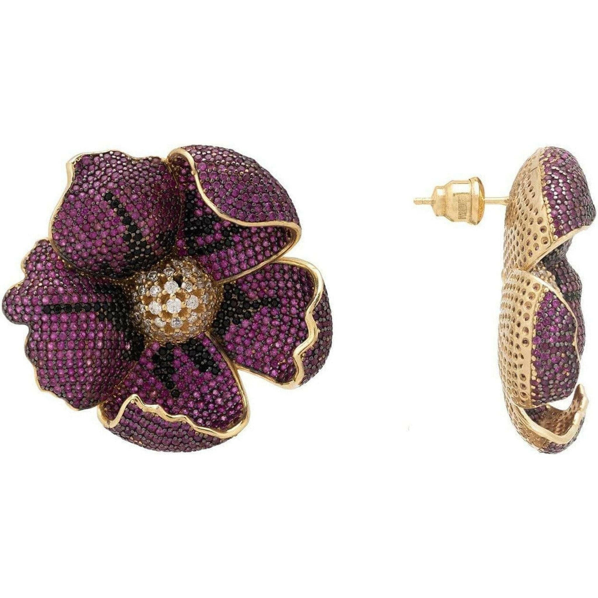 These large poppy earrings are adorned on each petal with ruby red and black sparkling cubic zirconia. Brilliant white zircons sit at their centre. Made in a three dimensional design for added interest, which will add a touch of sophisticated style to any outfit.