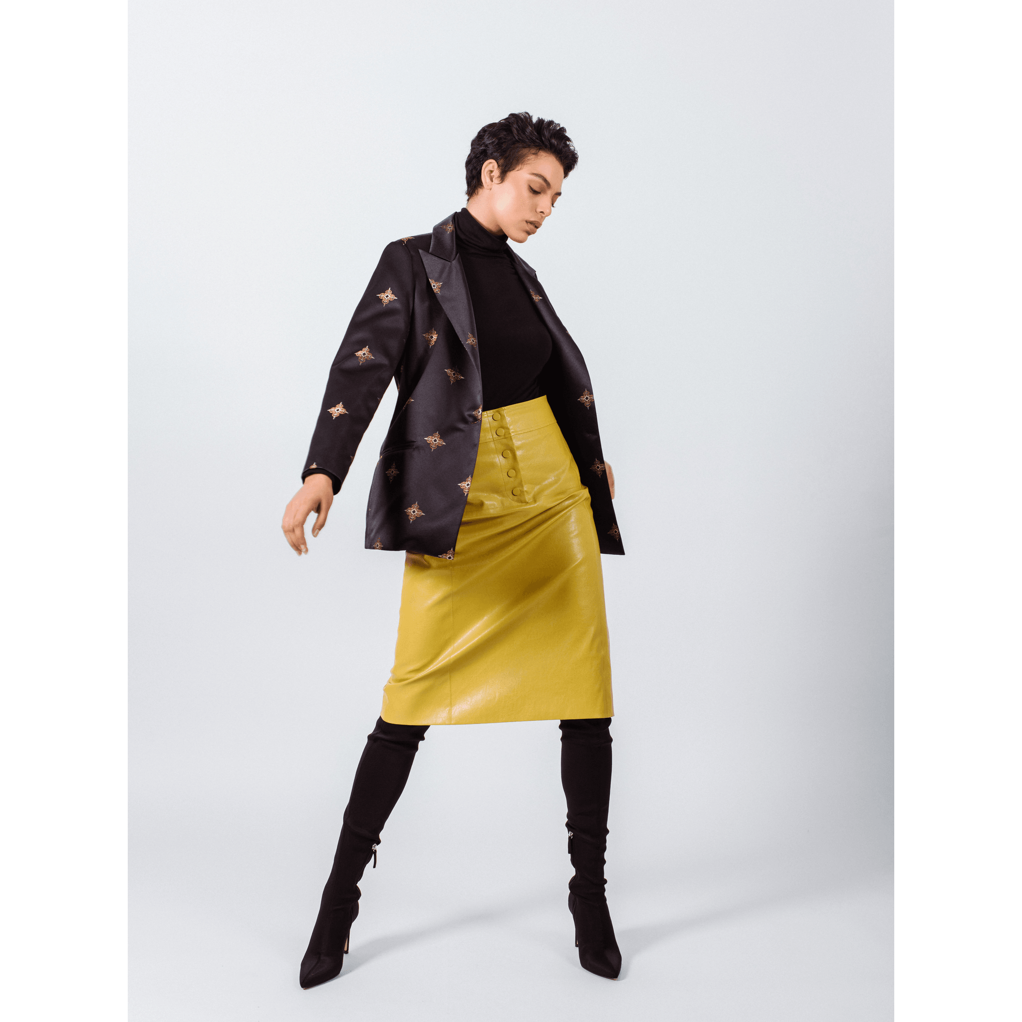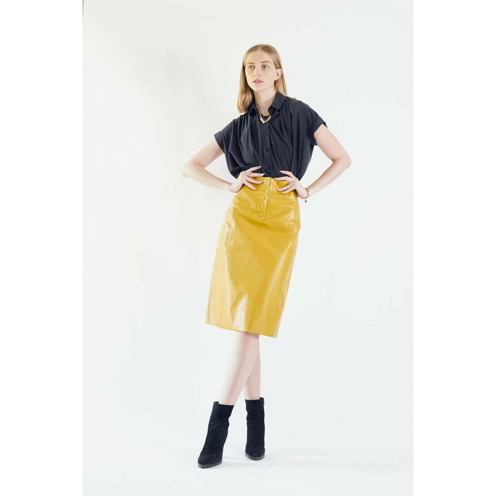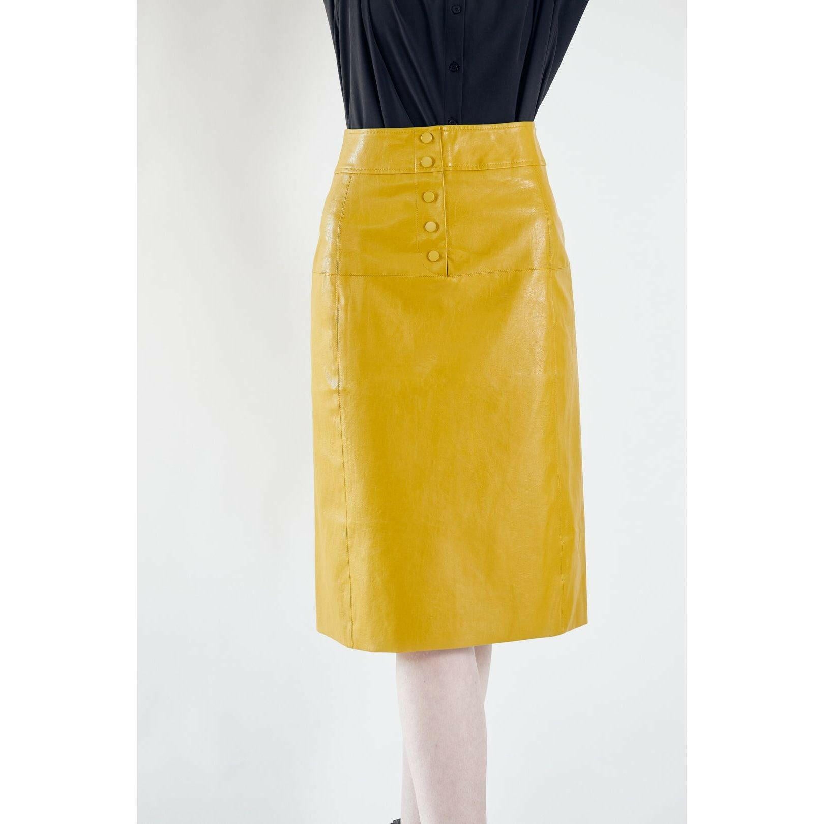 This Power Woman mustard leather skirt is designed for a figure-flattering fit. It offers a tailored look that is both comfortable and stylish. Perfect for any occasion.