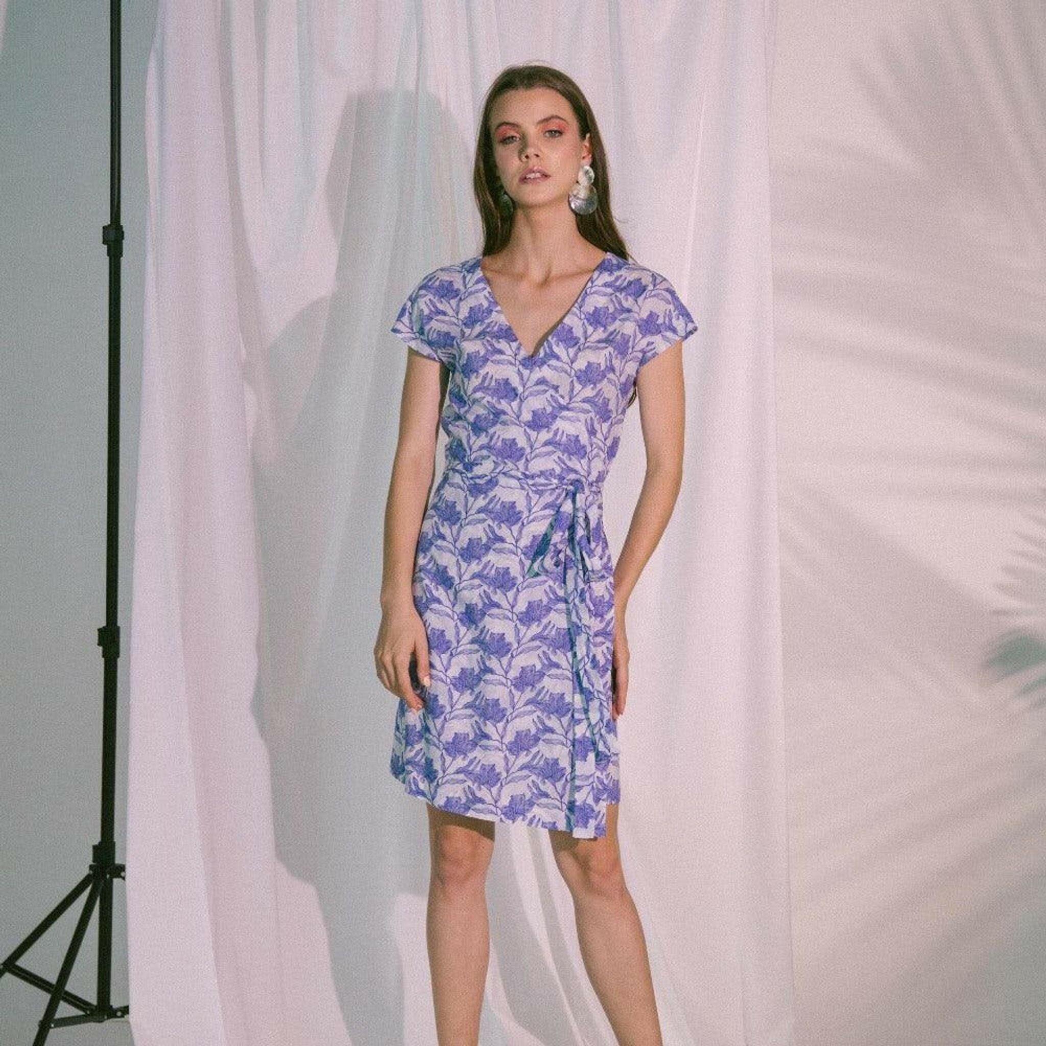 The Pragma Wrap Dress in the brand's blue biro print is your perfect summer dress. This dress has a wrap silhouette that cinches your waist with a self-tie belt. Short sleeved and with an asymmetrical hemline.