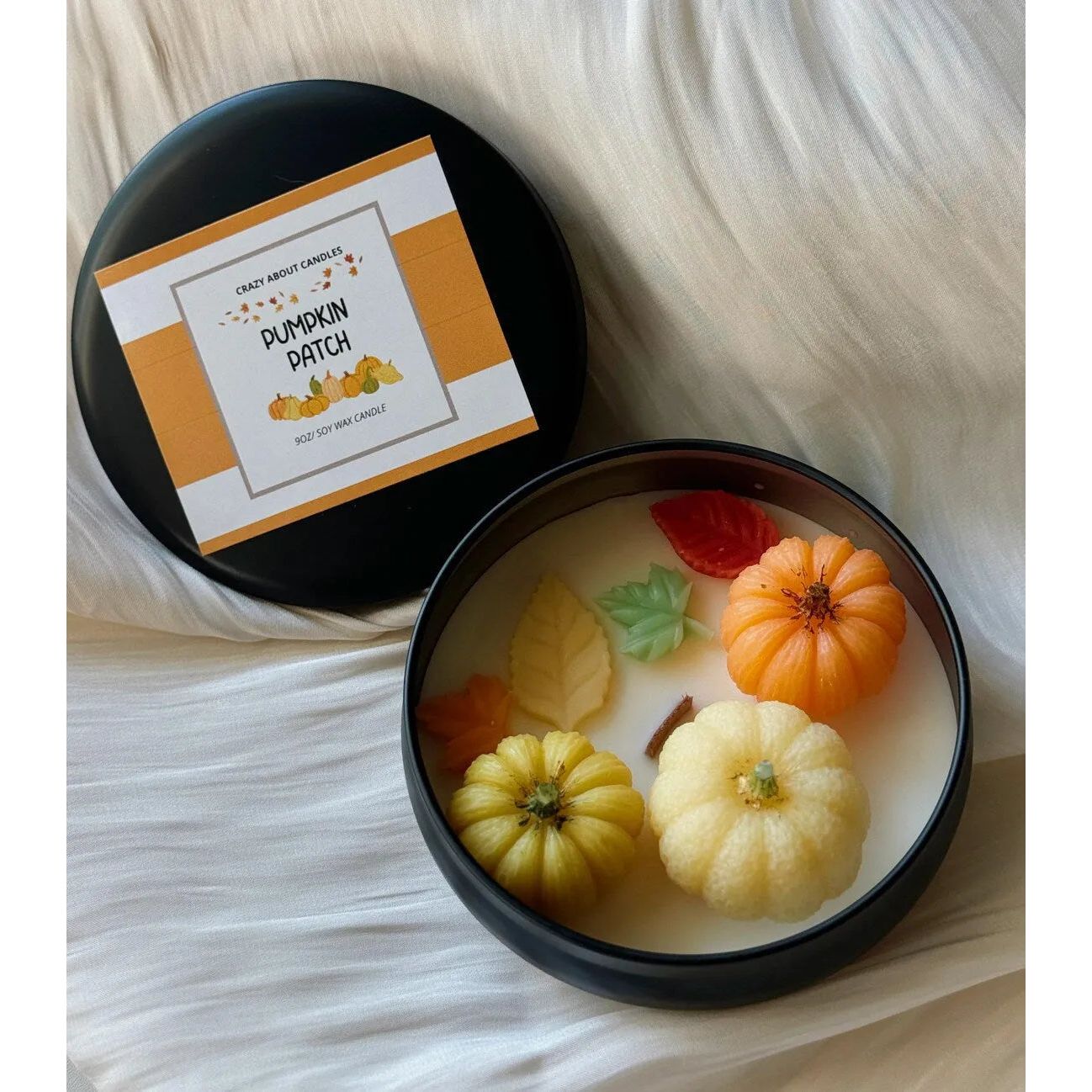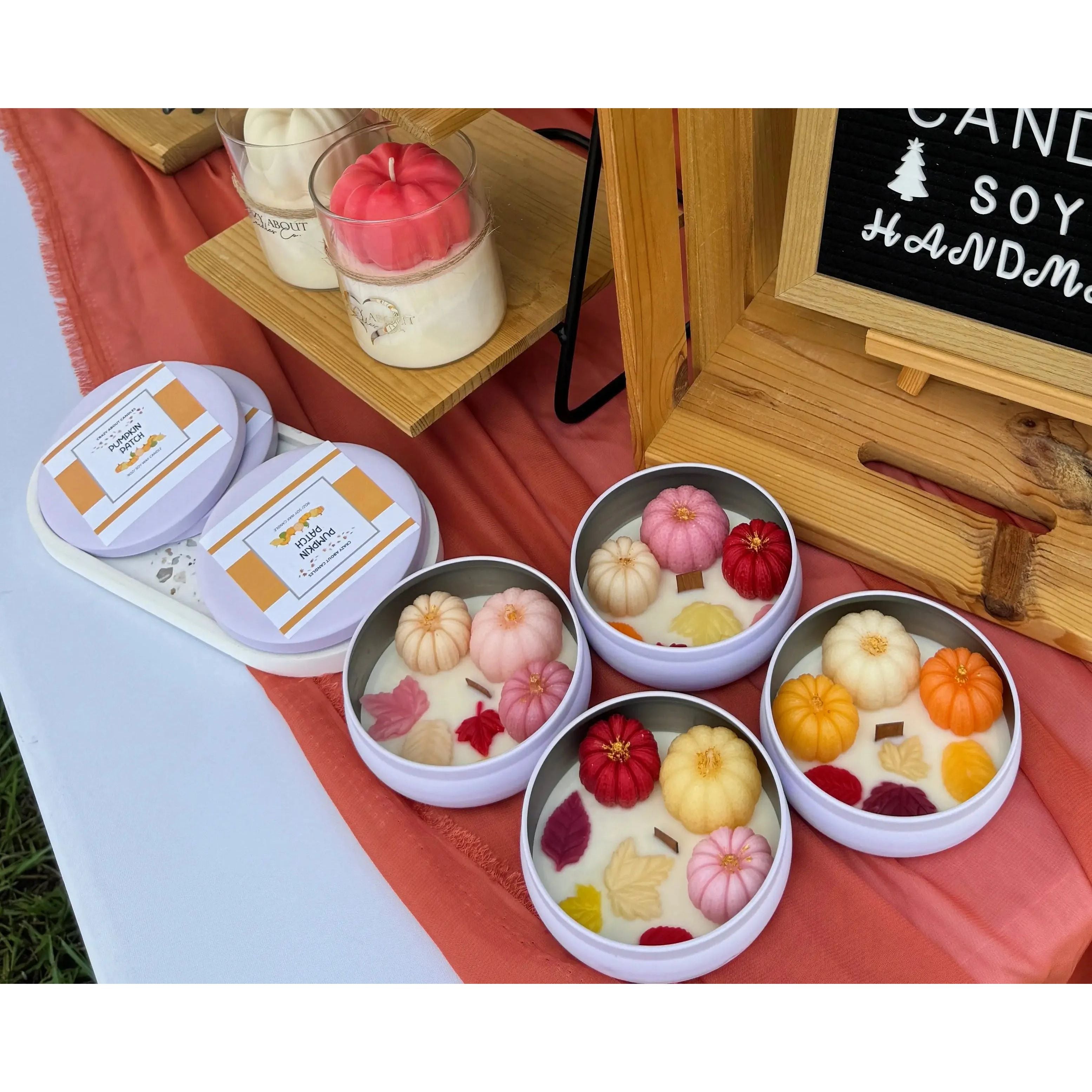 One-of-a-kind, handmade pumpkin-shaped candles in a convenient tin - perfect for autumn adornment or a playful present!
