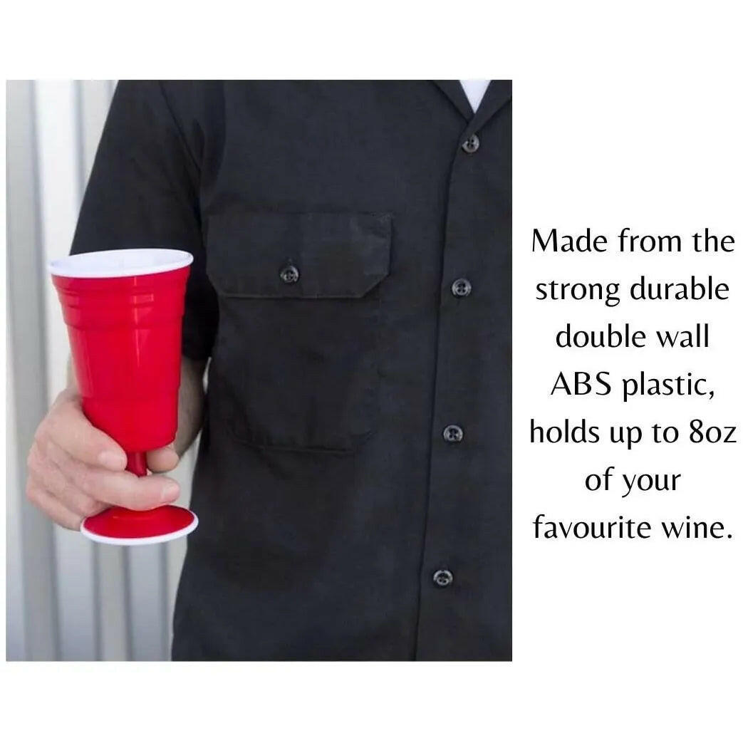 Time for wine? Indulge with this clever red plastic wine cup. Yep, it's a red cup on a stem - no wine snobs allowed! Enjoy 8 ounces of your favorite wine, pop it in the dishwasher and reuse all over again. Made of break-resistant and high quality plastic, this sturdy cup will delight everyone at your next get together. This wine cup is also available in a larger 14 oz. size.