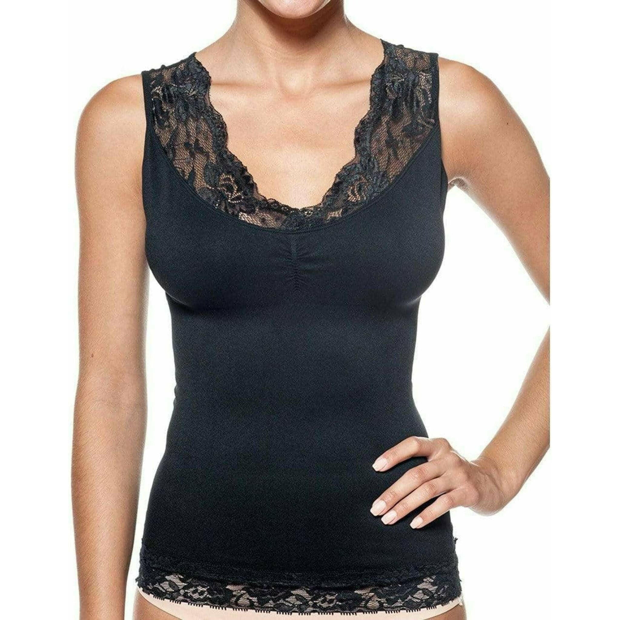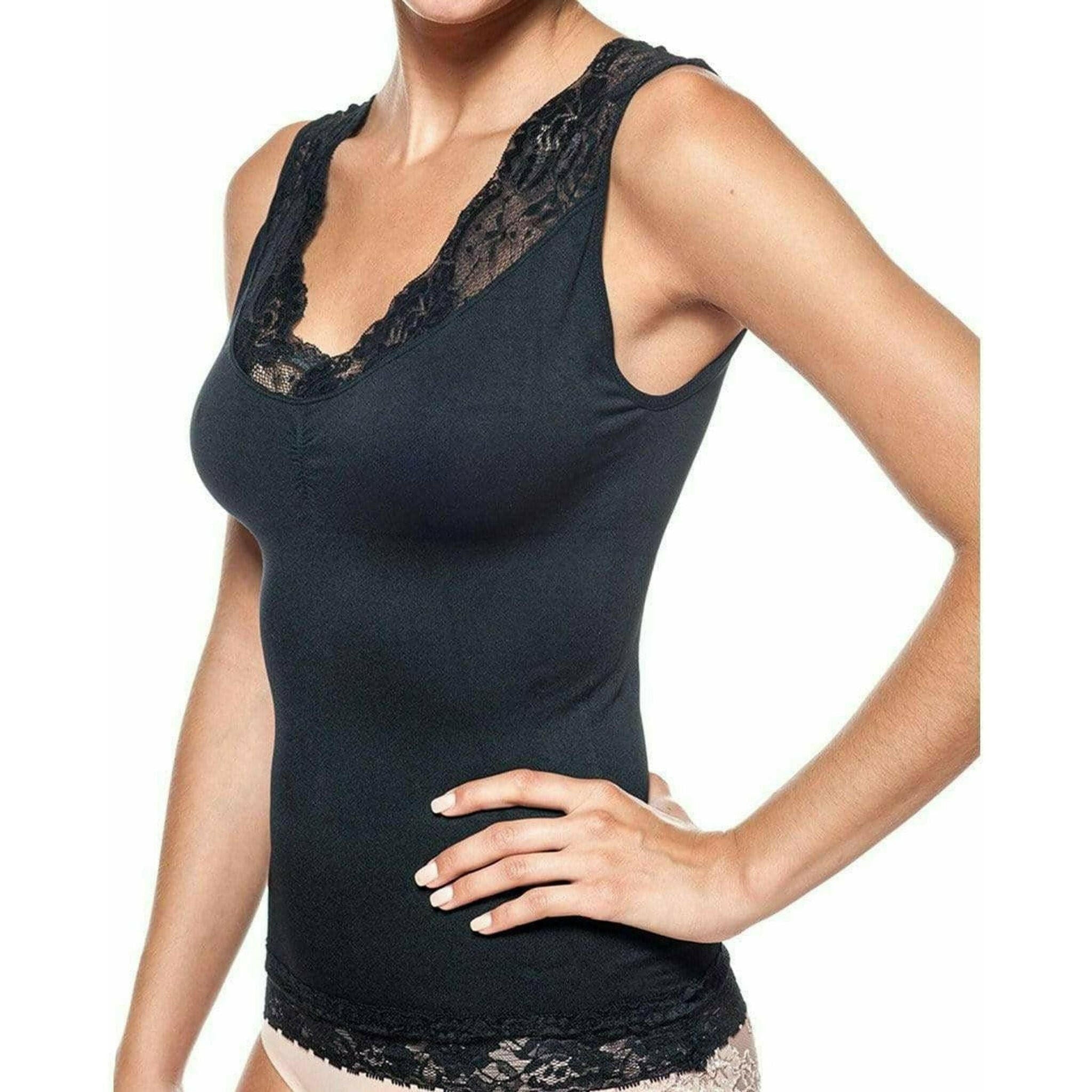 "Meant to be Seen " seamless shaping tank top with lace detail trim at bust and neck. Ultra-soft microfiber yarn that smooths you and has a soft touch to your skin. You'll love it! Style# 1124