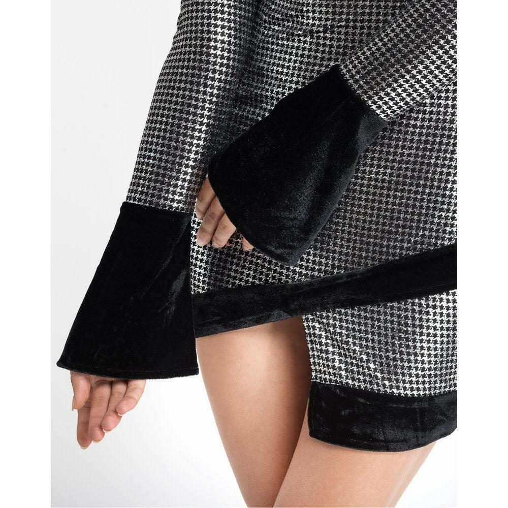 This shimmering silver party dress features a stunningly metallic silhouette, shoulder cutouts, high neck and black trim that will guarantee to turn heads.