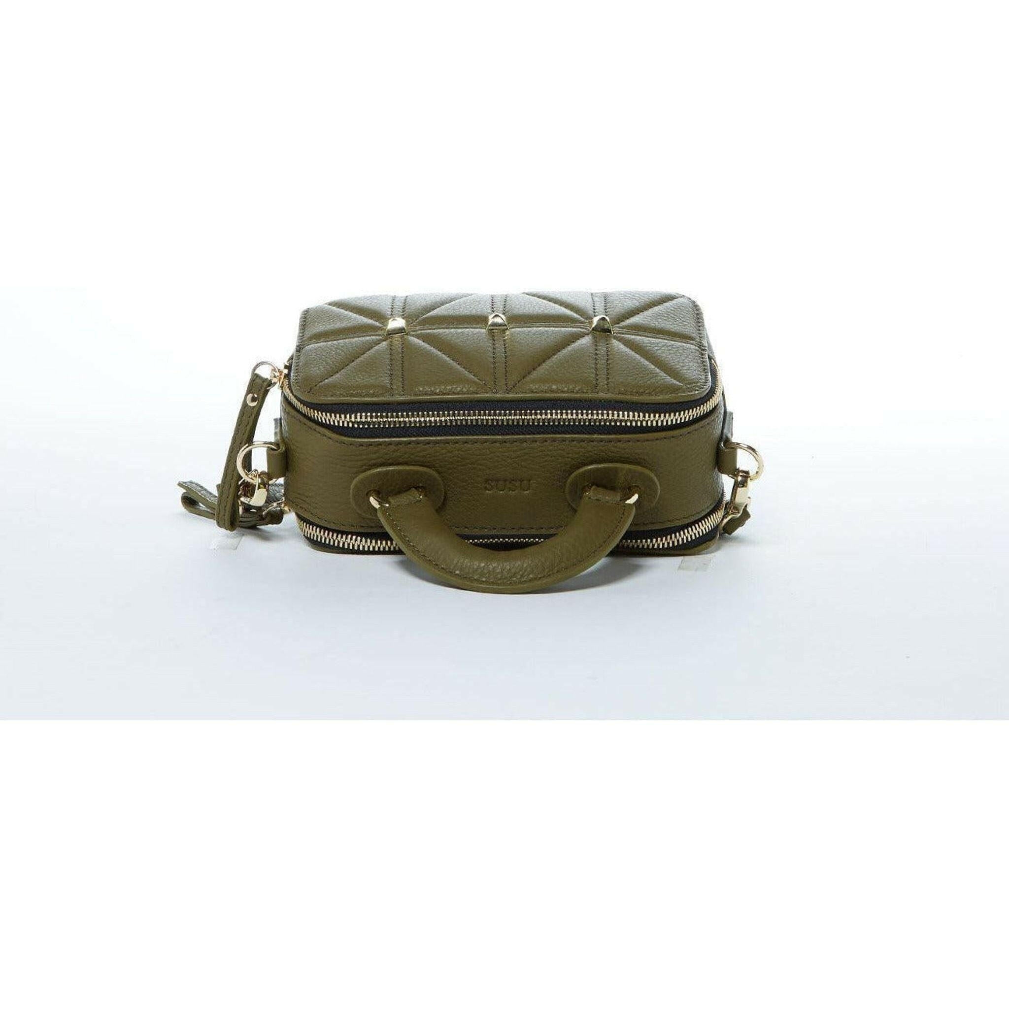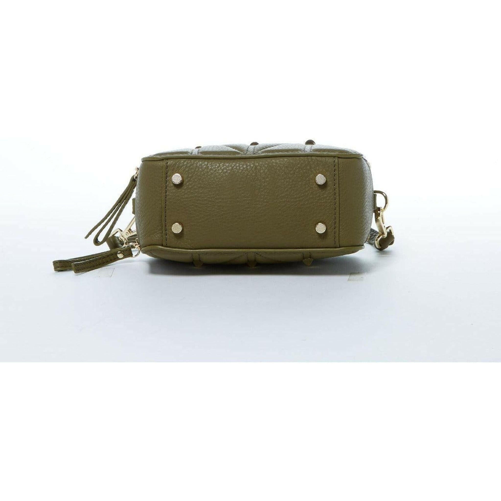 This quilted leather handbag is an instant classic!. Has a top handle with an adjustable shoulder strap allowing you to wear it multiple ways. Made with olive green quilted genuine Italian leather, 3 gold studs and accented with gold hardware. With 1 zipped outside pocket and 2 zipped interior pockets, it will keep your daily essentials organized. This micro studded purse can easily be styled with any outfit.