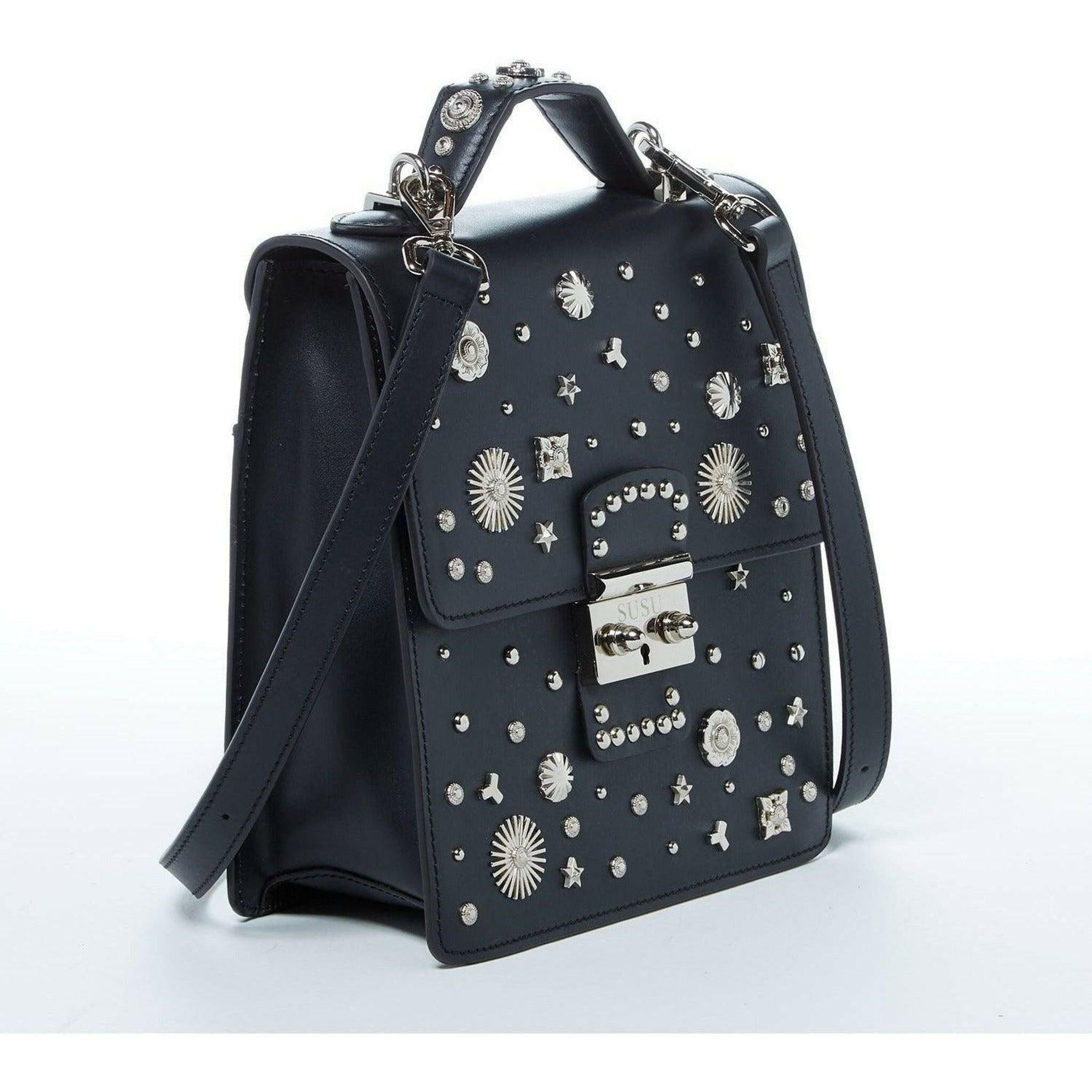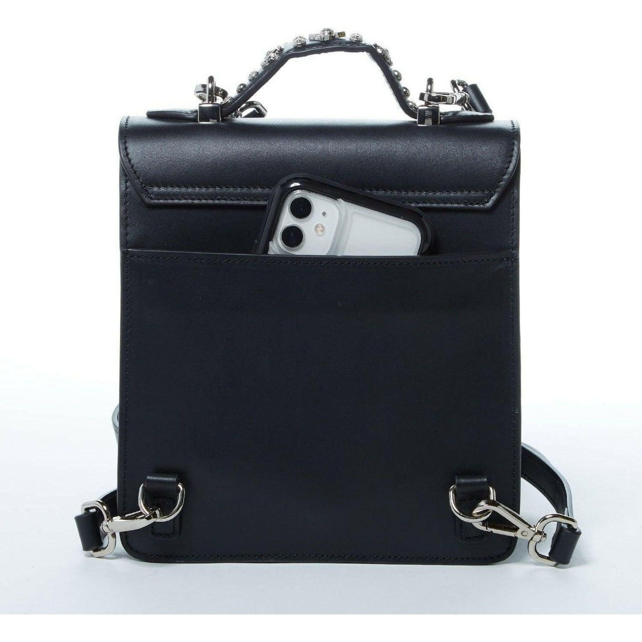 The iconic Hollywood style is presented in a sleek black backpack, perfect for on-the-go fashion. Featuring a boxy shape complemented by adjustable straps that not only move with you but also allow you to wear it as a crossbody or as a shoulder bag! Secured by a polished silver metal push lock on the front flap, a spacious interior with one zipper and one pouch pocket and a designated exterior back pocket. With carefully selected silver appliqués sitting atop black leather, this backpack purse is sure to set you apart from the rest. You’ll be charmed when you see this backpack in person and admire the way the appliqués pop against the leather and shine in the light.