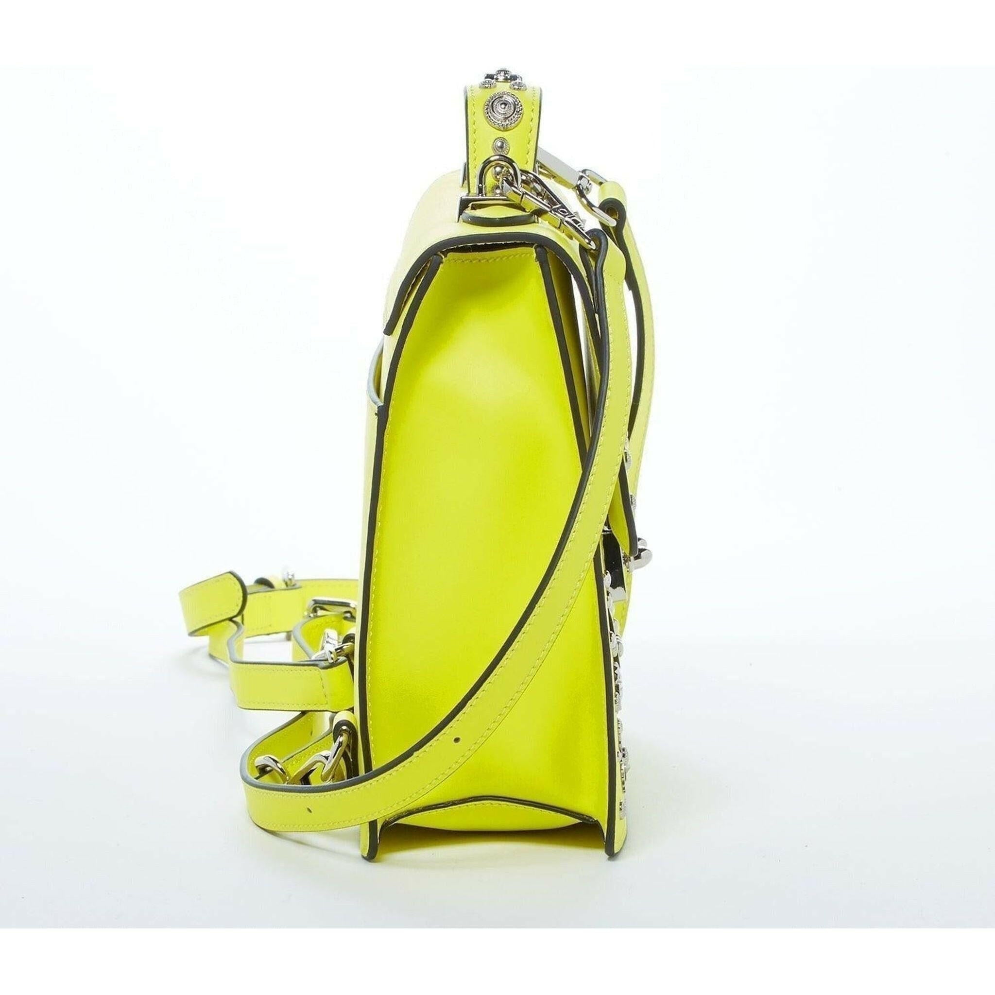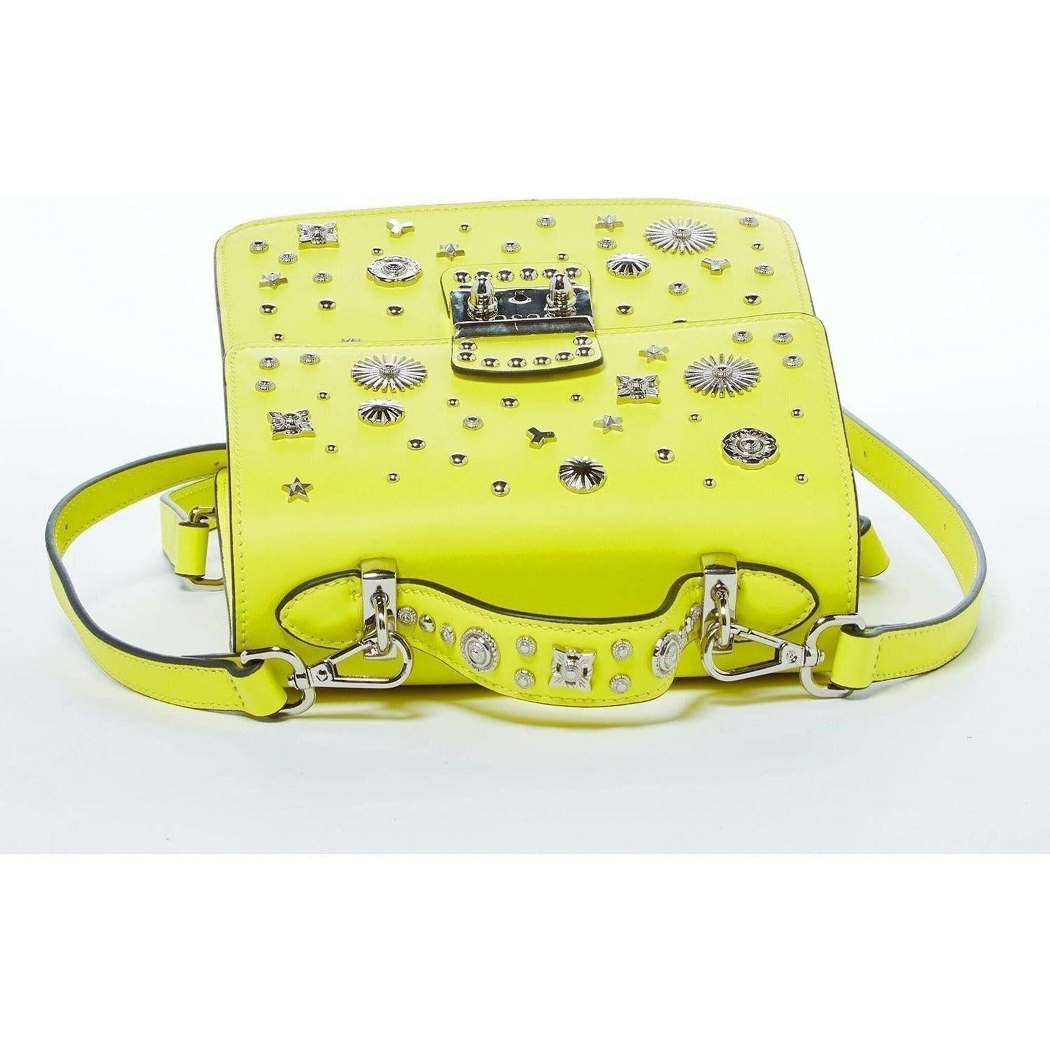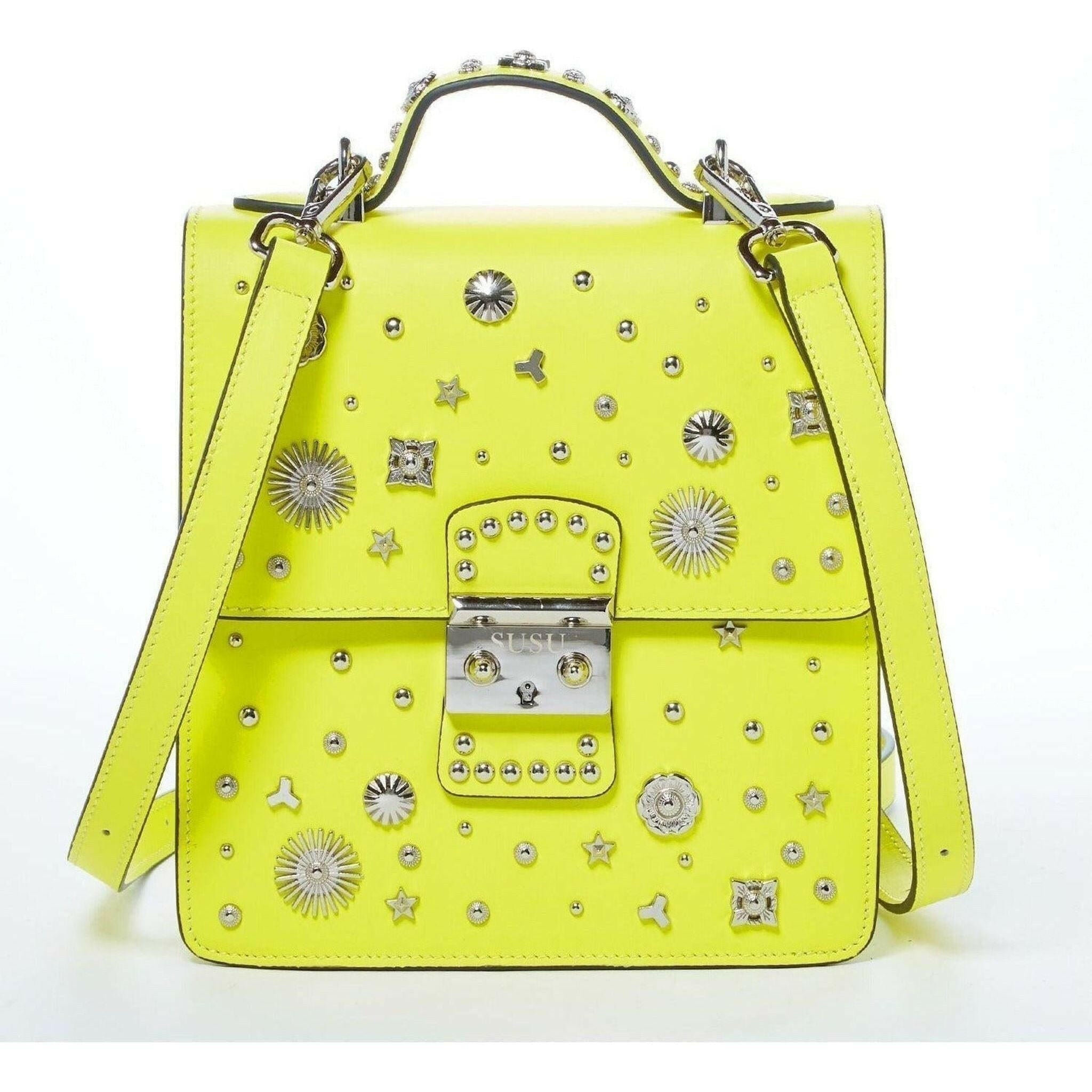 This Hollywood-style backpack in a vibrant yellow hue is an ideal choice for the fashion-conscious traveler.Featuring a boxy shape complemented by adjustable straps that not only move with you but also allow you to wear it as a crossbody or as a shoulder bag! Secured by a polished silver metal push lock on the front flap, a spacious interior with one zipper and one pouch pocket and a designated exterior back pocket. With carefully selected silver appliqués sitting atop yellow leather, this backpack purse is sure to set you apart from the rest. You’ll be charmed when you see this backpack in person and admire the way the appliqués pop against the leather and shine in the light.