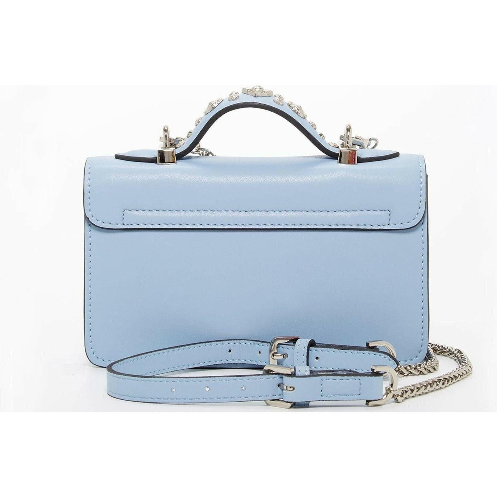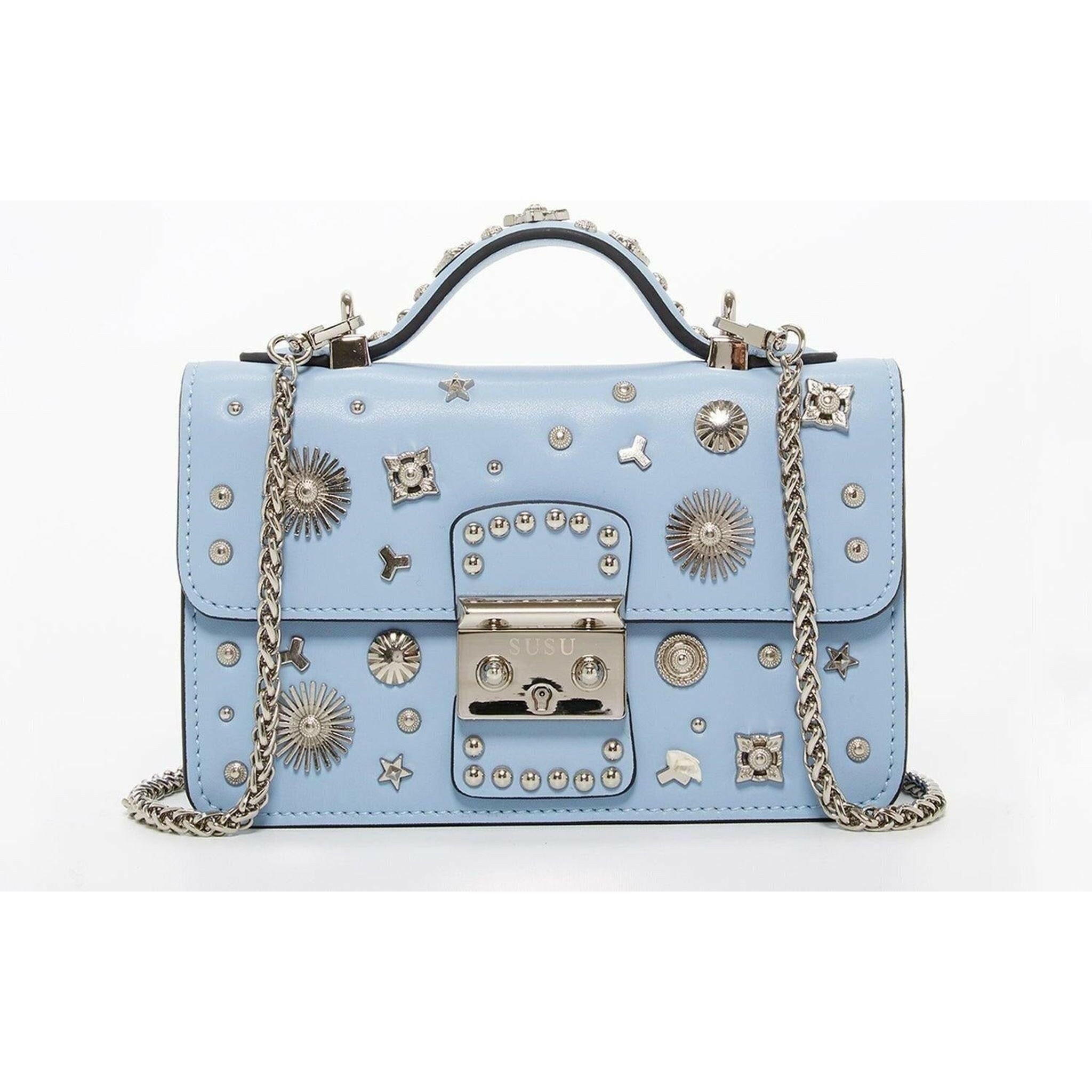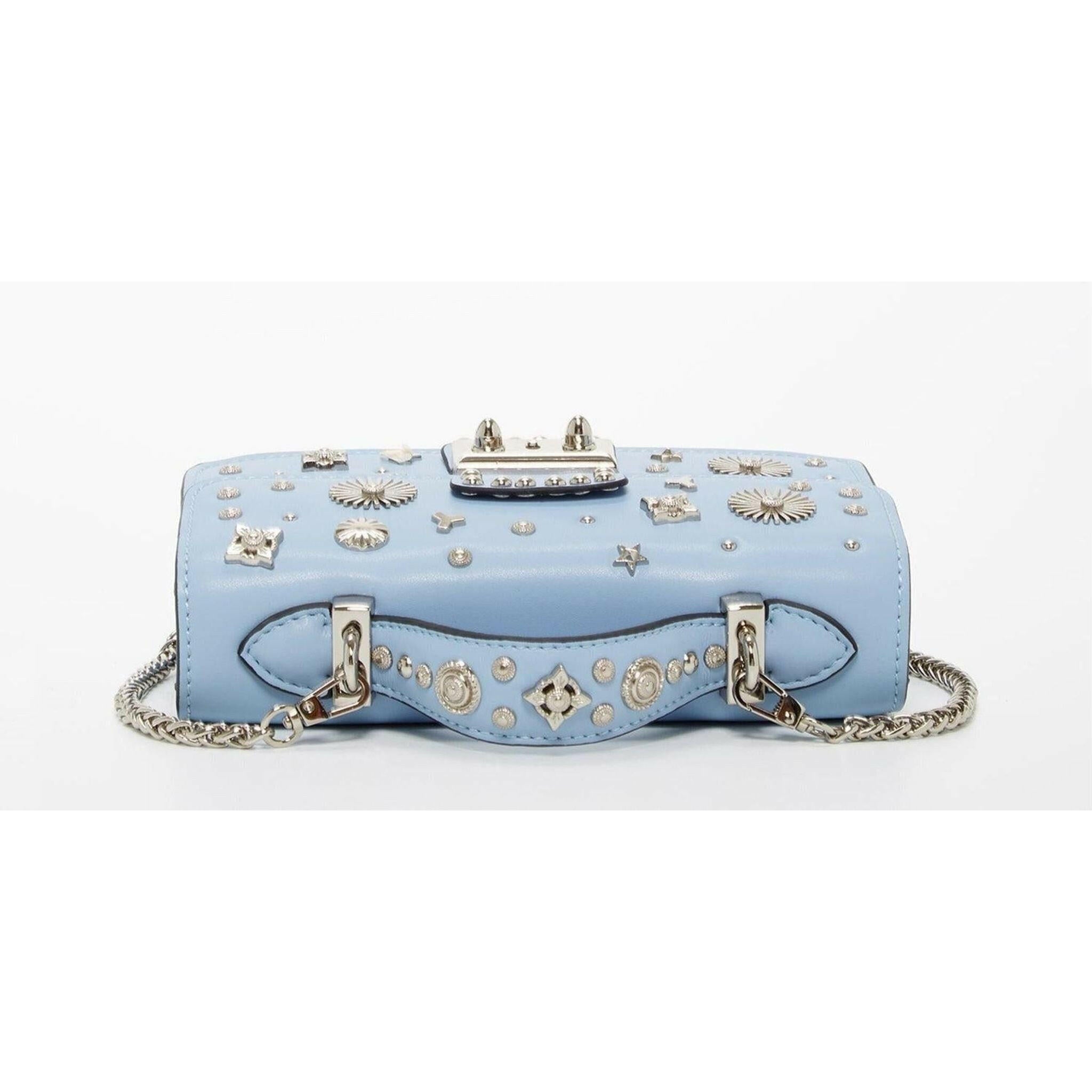 The stylish baby blue Hollywood leather bag features silver cool metal stud appliqués on the front of the bag and top handle. It is secured by a polished silver metal push lock on the front flap and has an adjustable and removable silver chain strap. Has a roomy interior zipped pocket and a slip pocket keeping all your essentials organized. The Hollywood’s leather top handle, allows you to wear this cool bag by its handle, over the shoulder, or as
