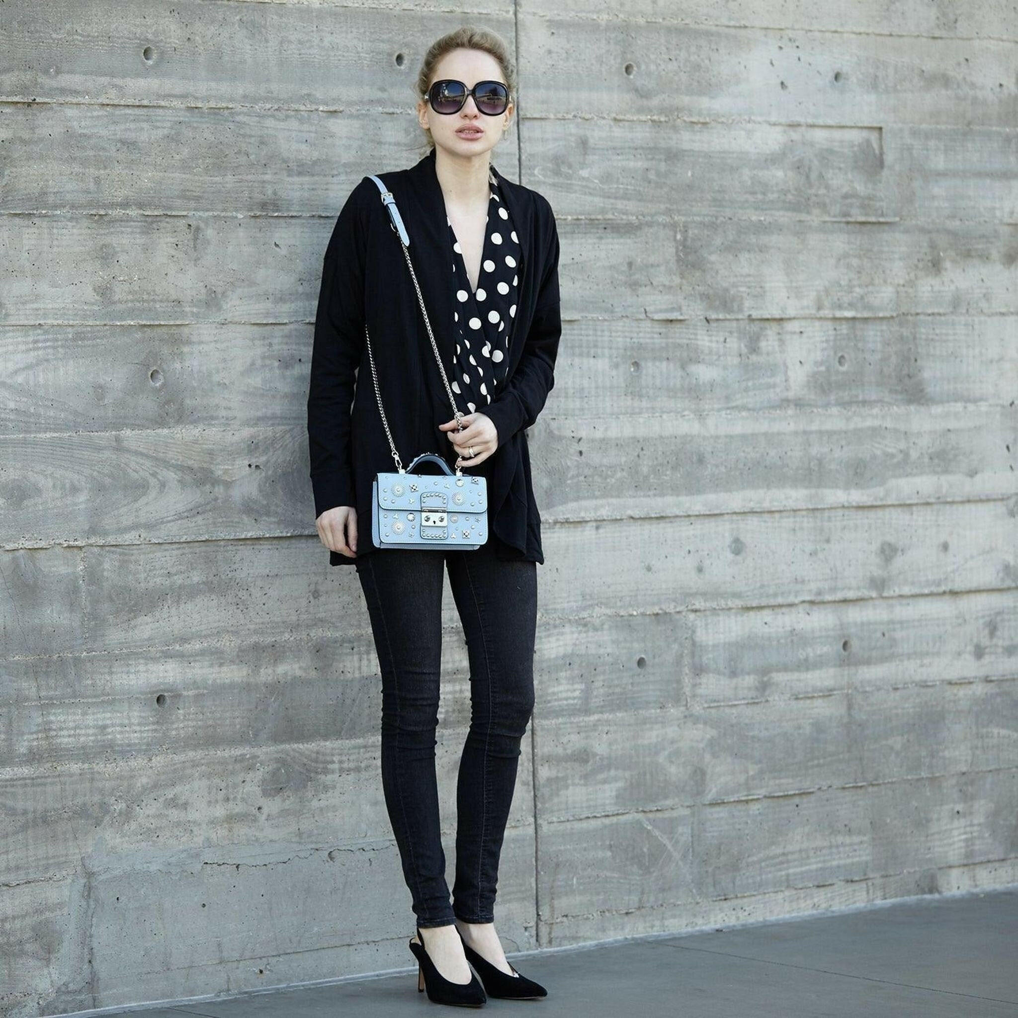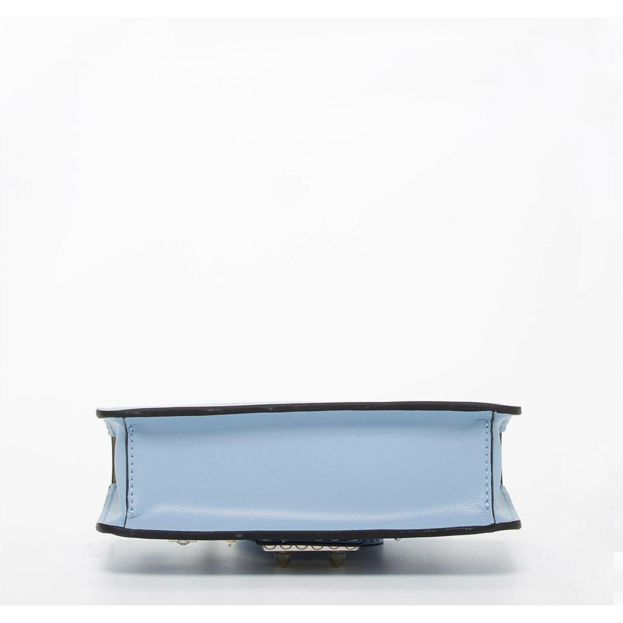 The stylish baby blue Hollywood leather bag features silver cool metal stud appliqués on the front of the bag and top handle. It is secured by a polished silver metal push lock on the front flap and has an adjustable and removable silver chain strap. Has a roomy interior zipped pocket and a slip pocket keeping all your essentials organized. The Hollywood’s leather top handle, allows you to wear this cool bag by its handle, over the shoulder, or as a chic crossbody style.