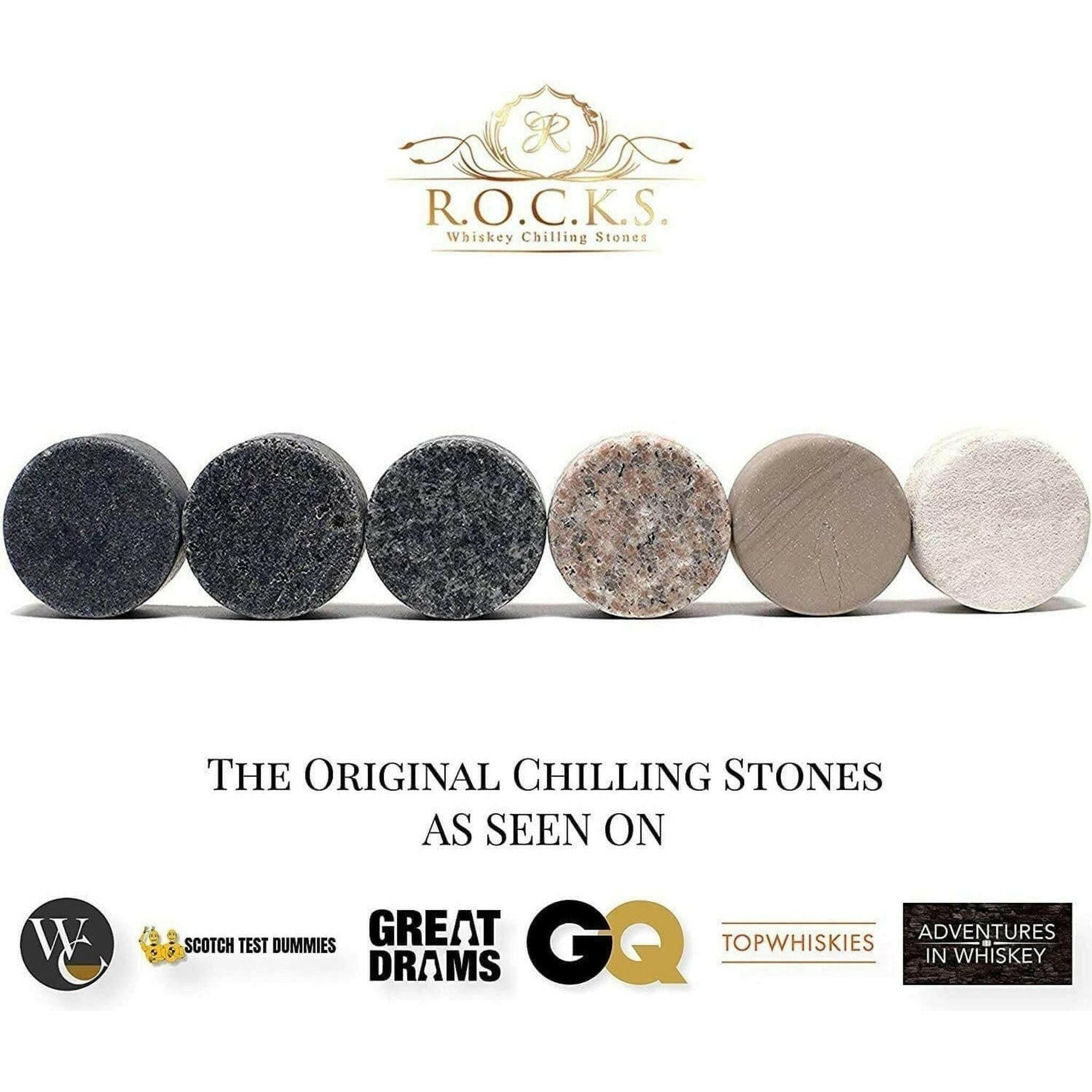Discover fast-cooling non-diluting round solid granite stones used to perfectly cool fine spirits without watering down your drink. Each of the 6 whiskey stones has a different color and granite-style making each set unique and stand out beautifully. Elevate your drinking experience or spoil a loved one with this bestseller.