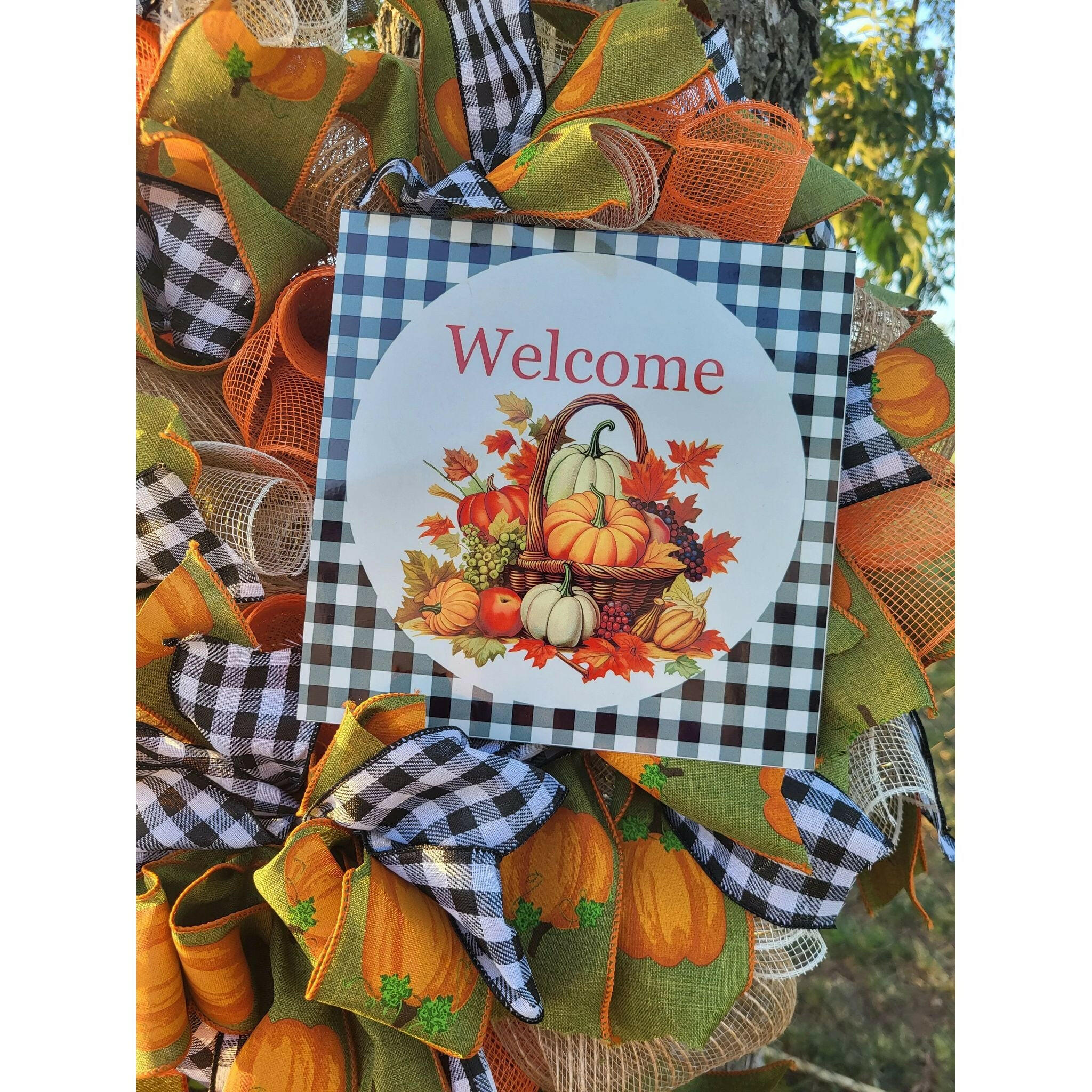 This handmade fall wreath will add to your traditional fall decor this season. This wreath is made of tan, cream, and orange deco mesh, black and white check ribbon, green with orange pumpkin ribbon and a handmade aluminum 8x8 square sign that has a basket of pumpkins with black and white border. The wreath measures approximately 21x21x6. Each wreath is individually handmade.