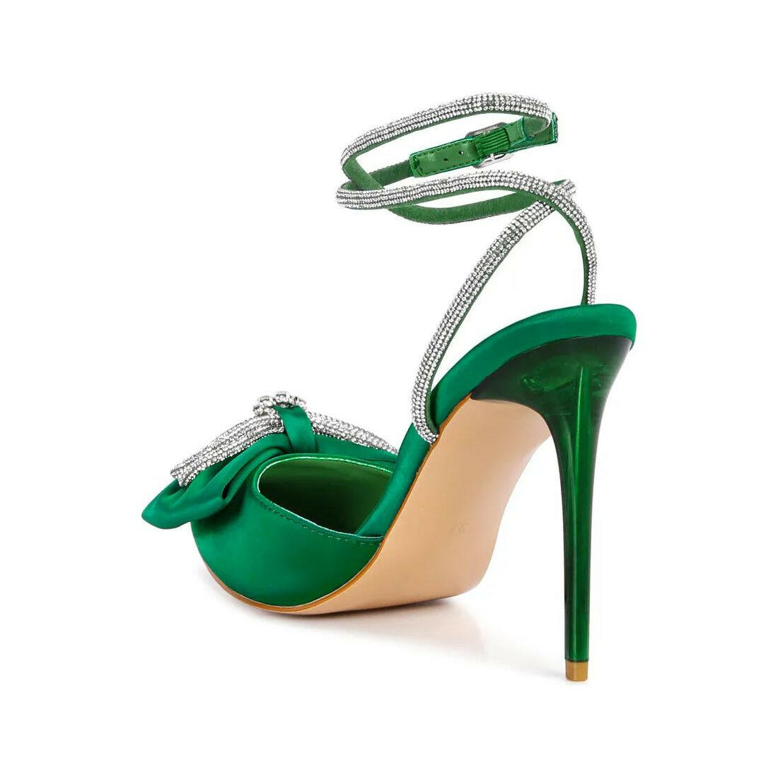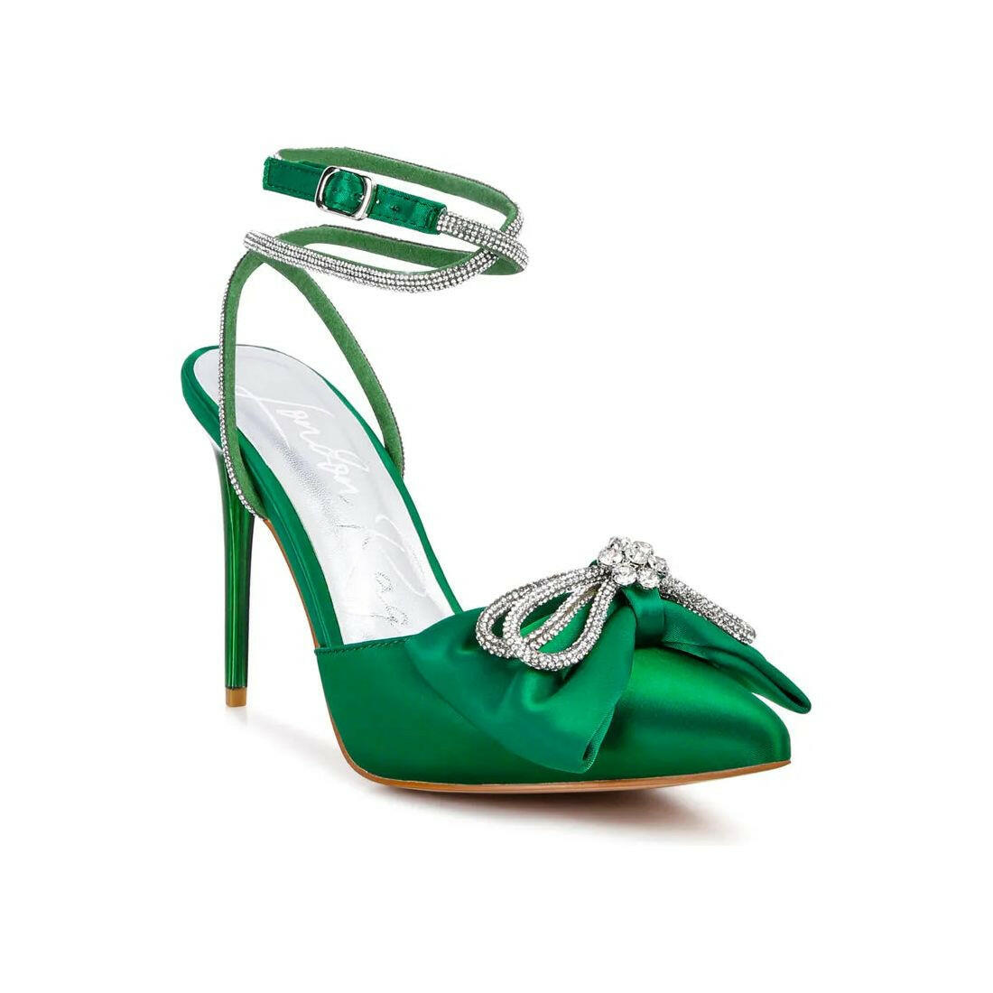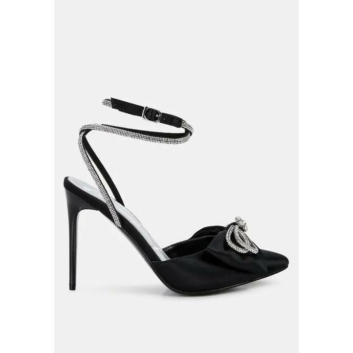 Feminie and sensuous: this is how these mule sandals are. High stiletto heeled satin sandals have diamante jewel bow perched on top which beautifully contrasts the rich velvet fabric. The ankle straps too have diamante details which are secured by pin buckle fastening. These high heeled sandals have soft cushioning which cuts strain.