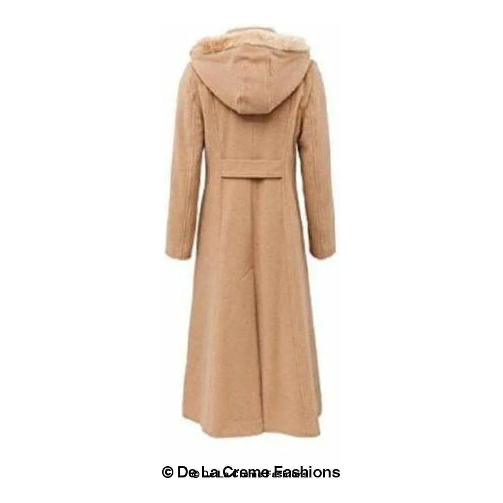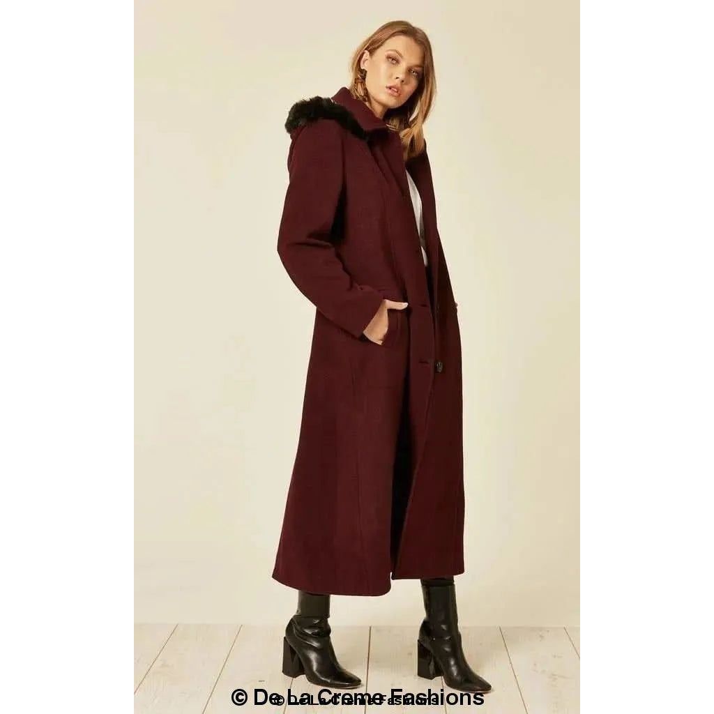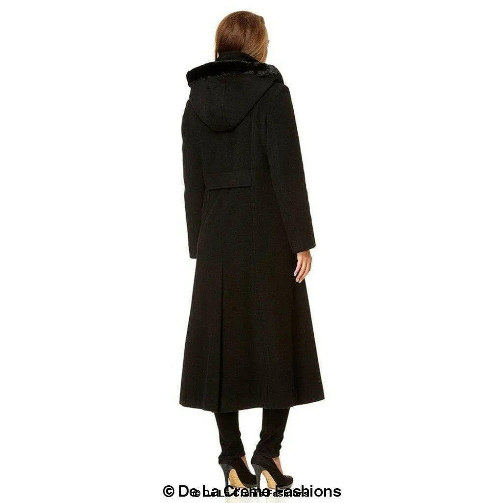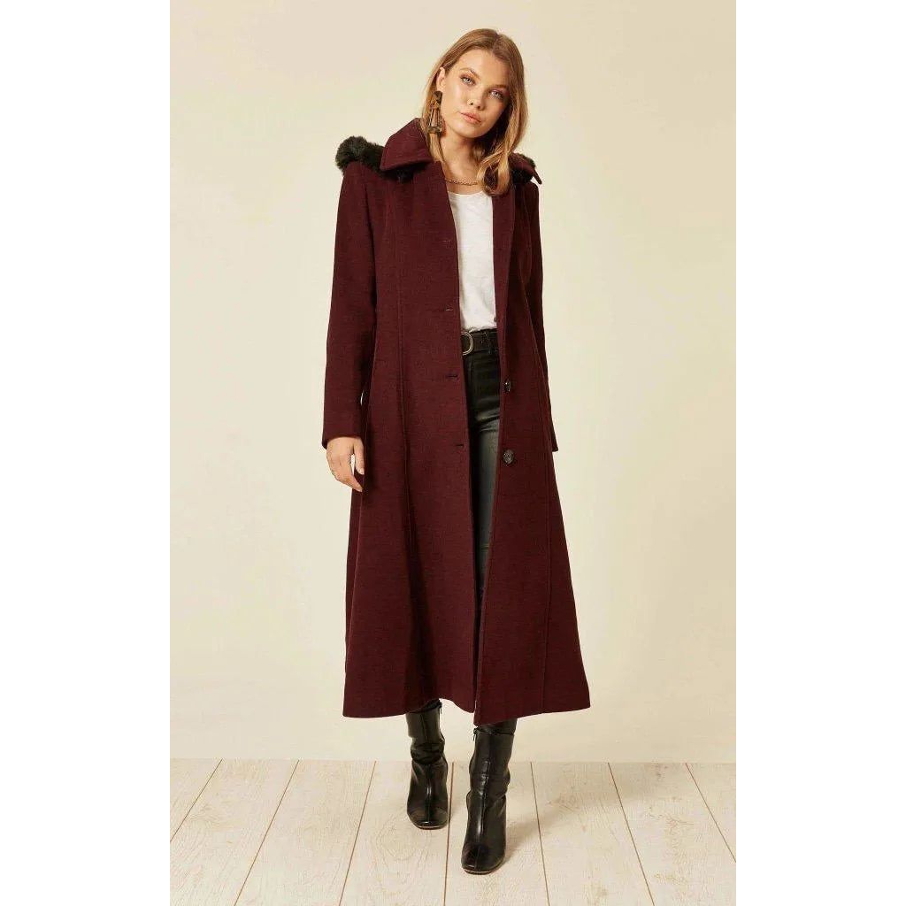 Wool Blend Faux Fur Trim Hooded Long Coat